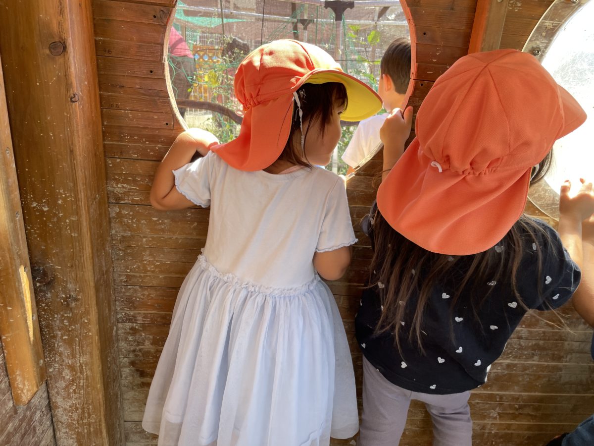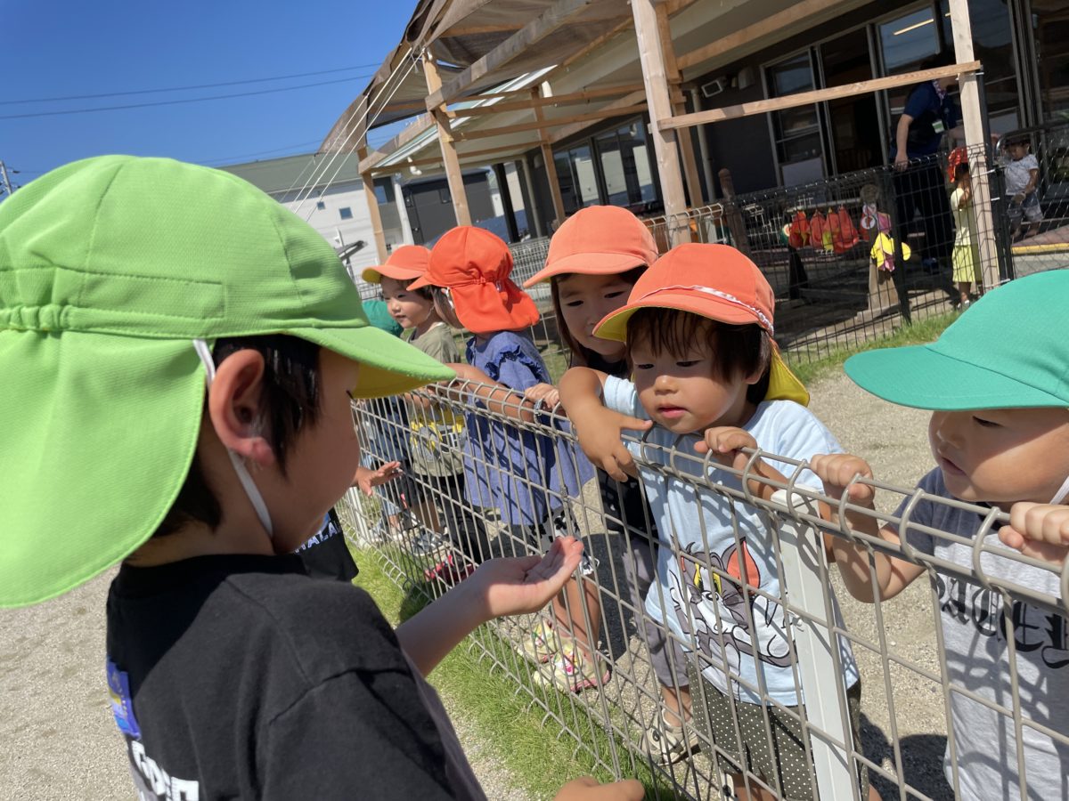 園庭ではログハウスの小窓から見える畑に興味津々!どうやら大きい子が野菜の収穫を行っていたようで、「おやさい?なにがある?」「ピーマン?」と、収穫しているのを小窓から顔を覗かせて楽しそうにお兄さん、お姉さんが収穫しているのを眺めていましたよ。そのご大きい園庭に出ると、先ほど収穫していたお野菜を持っている子を発見!お野菜を見たくて近づくと、袋を広げてくれて、収穫したばかりのお野菜を見ることが出来ました!後でなんのお野菜があったのかを聞くと、「やっぱりぴーまんあったでー!」とニコニコ笑顔で教えてくれました。夏野菜の収穫もそろそろ終盤に差し掛かってきましたが、これからも野菜がなる以上観察をしていきたいと思っています。