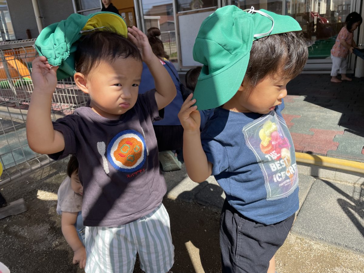 帽子を被ろうと帽子のつばを持って頑張る姿がありました。