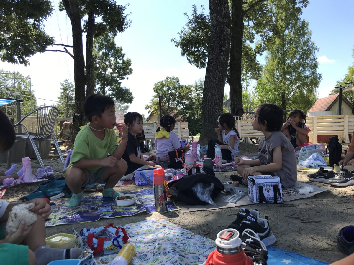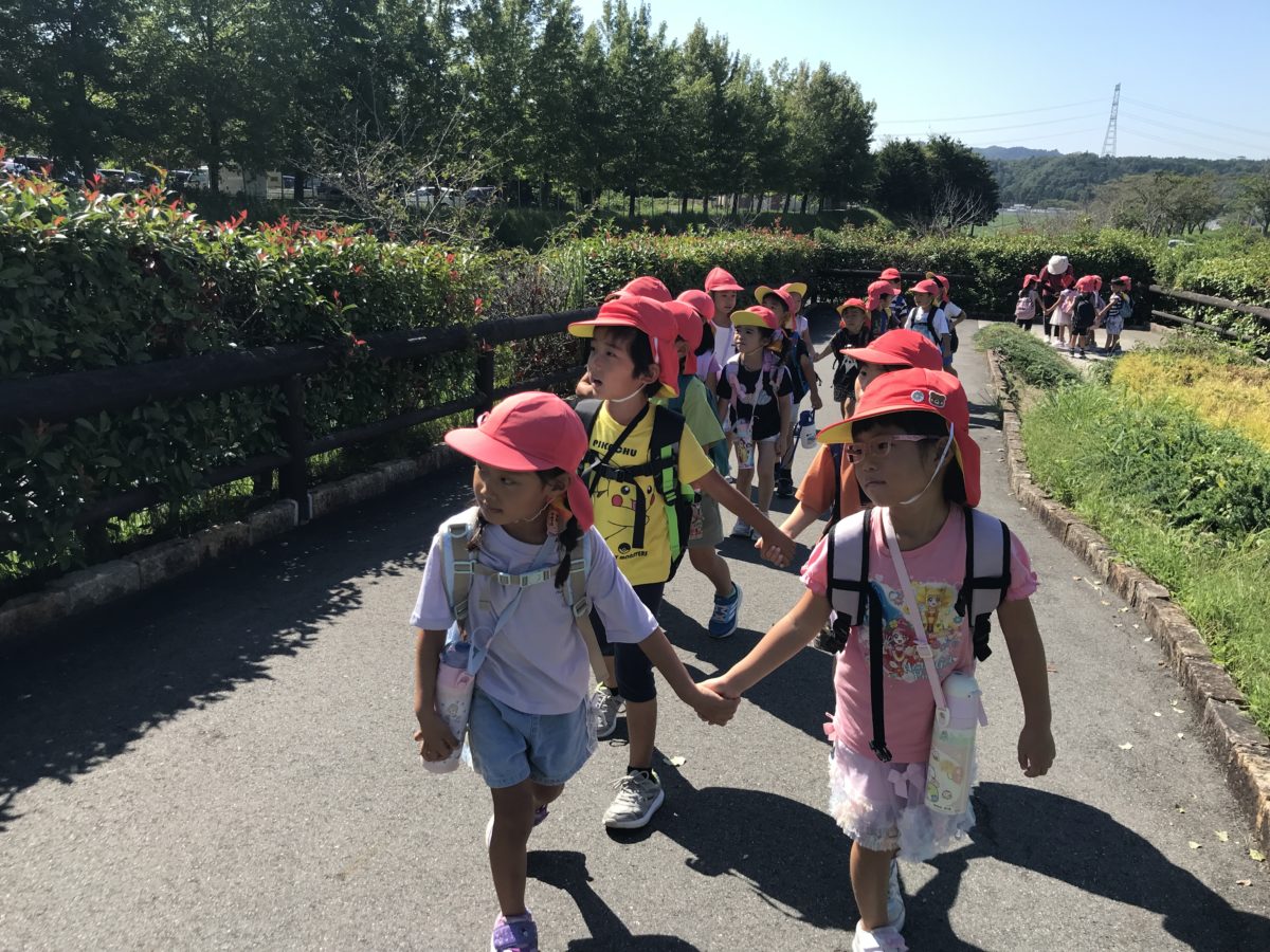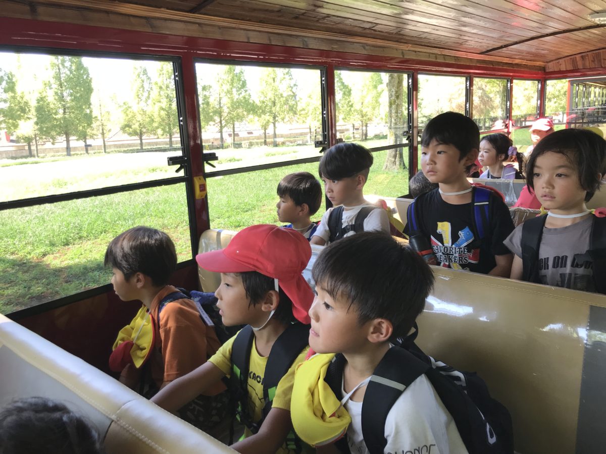 待ちに待った遠足の日!「はやくいきたいー!」「ブルーメのおか、いったことあるで!」「どうぶついっぱいおるんやって!」とみんなワクワクした気持ちで保育園を出発しました。バスの中では、『しずかに』というルールを守りながらも「こことおったことあるー!」「ここ1ごうせんやんな?」と会話を弾ませていました。その中で「トンネルや!」「なんびょう、かかるかかぞえてみよ!」「いくよ、せーの」「1,2,3・・400,401」「401びょうかかった!」「むっちゃながいトンネルやったなー」と数を数えたり「これはうえからいしがおちてくるかもしれやんっていうマークやでー」と標識に興味を示したりと周りの景色を見ながら学んでいる様子がありました。ブルーメの丘に到着し、さっそく近くを通っていた『チューチュートレイン』に乗ることに!「こののりものってでんしゃかな?バスかな?」と疑問を持ちながら乗り込む様子がありました。「のってきたバスよりおそいからバスじゃないんじゃない?」「でも、でんしゃもはやいでー」「あぶないからゆっくりすすんどるじゃない?」「ゆっくりバスやなー」と疑問点をみんなで話しながら解決していました。「あそこ、なんかみえる!」「どうぶつおるー!」「かんがるーじゃない!?」「ちかくでみたい!」とみんな大盛り上がり!チューチュートレインを降りて動物エリアに向かいました。まずはじめに見えてきたのは・・「うしや!」「おっきい!」と牛を発見!近くで見れるのが嬉しかったのかとても真剣な眼差しで観察する姿がありました。「あっちにひつじもおる!」「やぎもおるでー」と色々な種類の動物に興味津々!目や体の大きさや毛の長さなど違いを見つけたり、分からない動物がいると近くの看板の文字を見て「あ、る、ぱ、かってかいてある!」「アルパカっていうんや!」と自分たちで調べながら観察する姿がありました。お弁当の時間になると「おいしいー」「すきなものいっぱいはいってる!」と嬉しそうな表情でお弁当をいただきました。帰りの道中では、少し疲れてウトウトと寝ている子や楽しかったことをお友だちと話す子など様々でした。動物エリアや水遊びエリアなどそれぞれ楽しい!おもしろい!を感じながら笑顔がいっぱいの一日になりました。朝早くからお弁当のご協力ありがとうございました。
