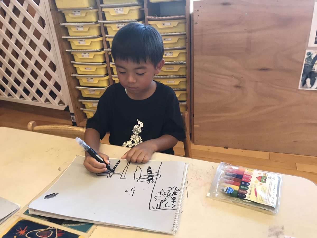 「ここは黒やったっけ?」と思い出しながらトンボの絵を描いています。