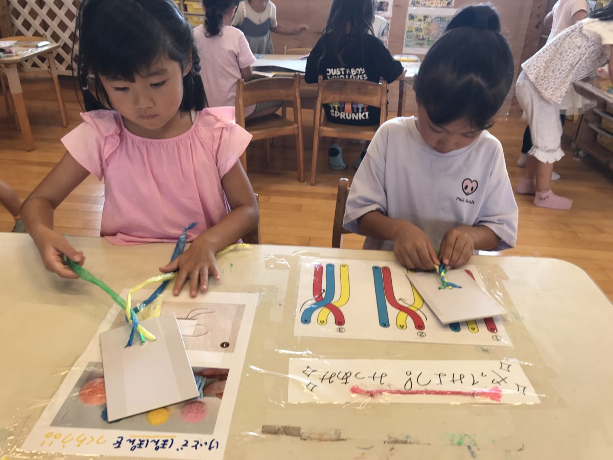 戸外では3チームに分かれてリレーをしました。めろん組さんの「よーい、どん!」の合図に合わせて子どもたちが全力で走り始めていました。また順番が分からないさくらんぼ組さんに対し、お兄さんやお姉さんが「次だよ!」と声をかけてくれ、時には一緒に走ってくれる姿も見られました。途中「〇番がいない!」というハプニングもあったのですが、「僕が二回走るよ。」というかっこいい姿があり、みんなで協力し合っていました。ダンスの活動では、新しい曲がかかると積極的に踊っている姿があり、時にはみんなの見本になるよう前で踊ってくれるお友だちもいました。ハードルや跳び箱を用意すると、りんご組さんが順番に並びながらジャンプして楽しそうに遊ぶ姿が見られました。お部屋では三つ編みに挑戦していました。自分で好きな長さにテープを切り、お友だちに抑えてもらいながら慎重に編んでいました。途中「四本でも出来るかも」という気づきもあり、四本や二本でも編めるのかどうか試していました。細かく編むお友だちもいれば、緩く編むお友だちもいて子どもによって様々で「○○ちゃん上手だね!」と見比べる姿もありました。また、毛糸を使ってボンボンや指編みをしているお友だちもいました。ボンボンを作る際はハサミを上手く使えなかったりと苦戦する姿もありましたが、作り方が分かるお友だちを中心に教え合いながら協力して作る姿が見られました。また、お手本がなくても色々と工夫してアレンジをしているめろん組さんもいて流石だなと感じました。