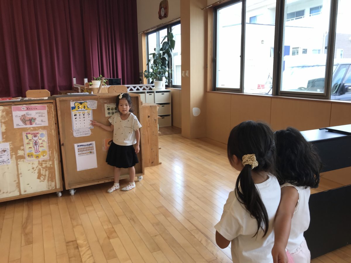「これは?」「かたほうのめはかくすんやでー」と教え合いながら視力検査ごっこに夢中!