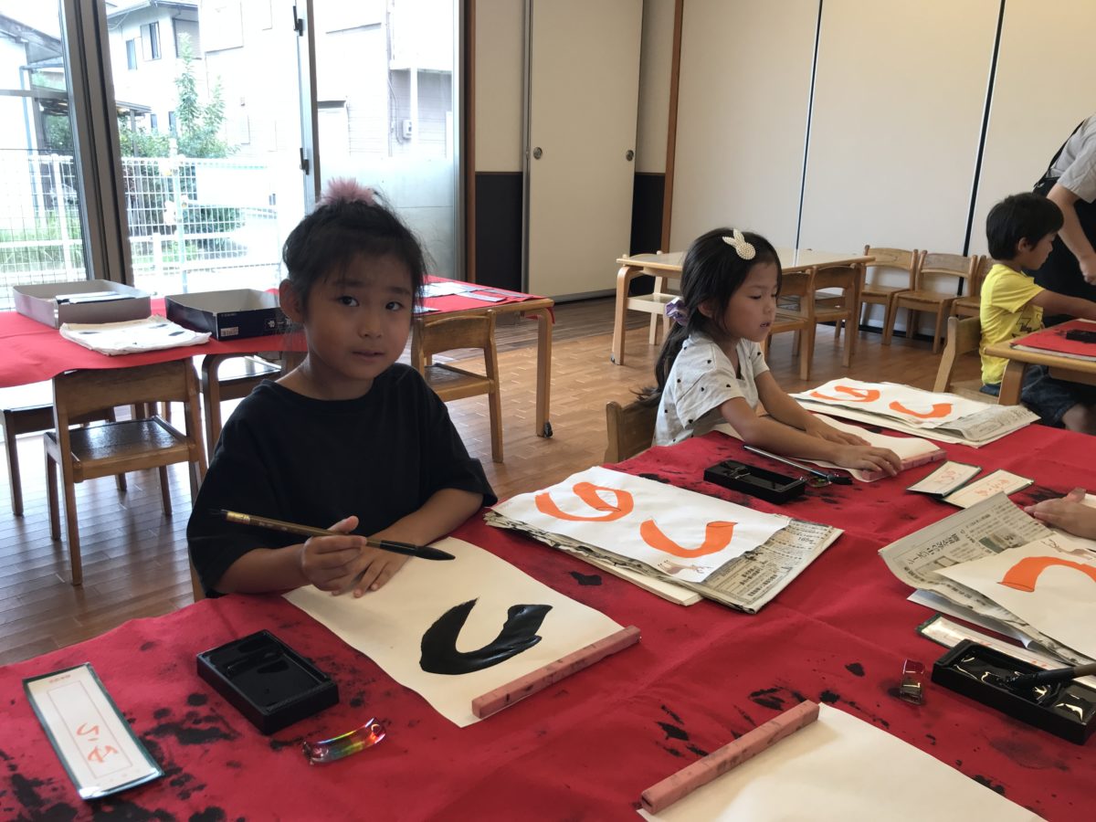 習字教室では『とめ』『はらい』を意識して真剣な表情で書く姿がありました。