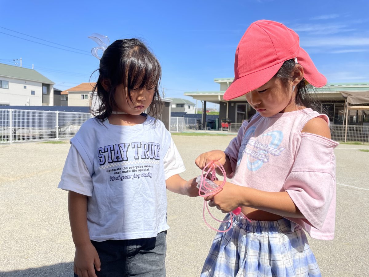 縄跳を跳んだ後、片付けるのに縄跳を結ぶのに一生懸命になってました。