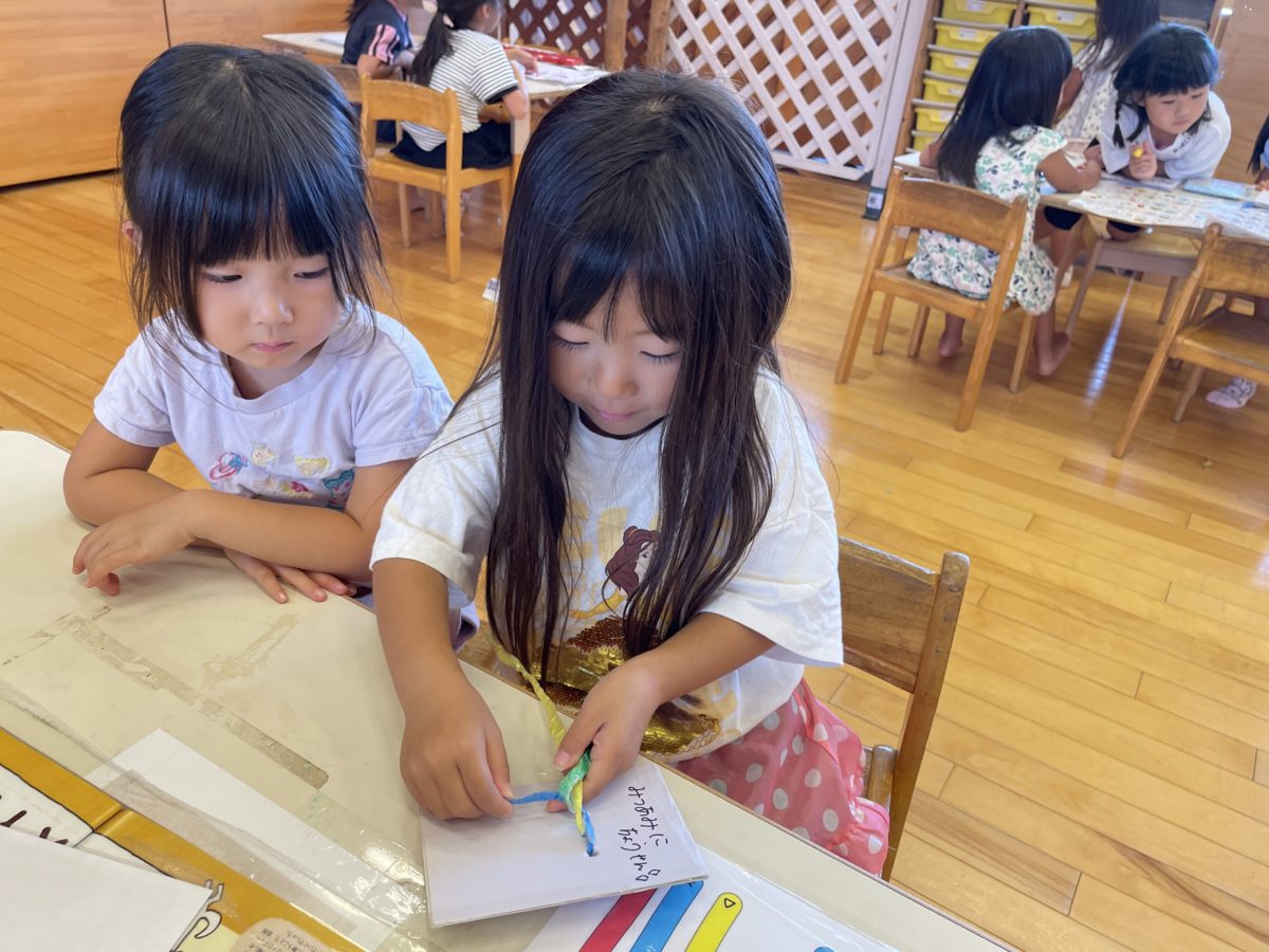 先日お姉さんたちがみつあみに挑戦していて、横で見ていたさくらんぼ組さんのお友だちも挑戦したかったようで、説明の写真を見ながら一生懸命取り組んでいました。
