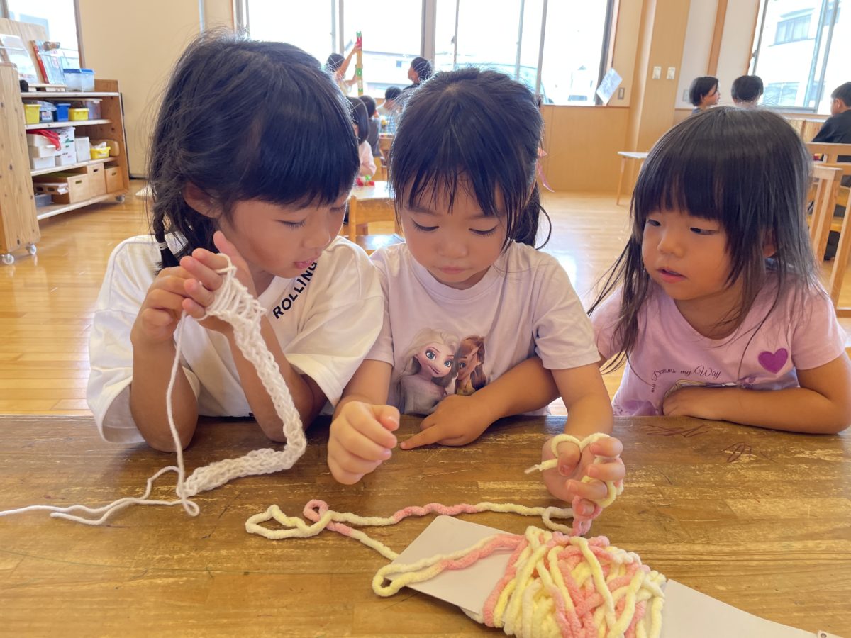 先日から大ハマりの指編み。今日は長いマフラーを作る!っと張り切っていた所他のお友だちもやりたいと言うので、自分も編みながら教える姿もありました。