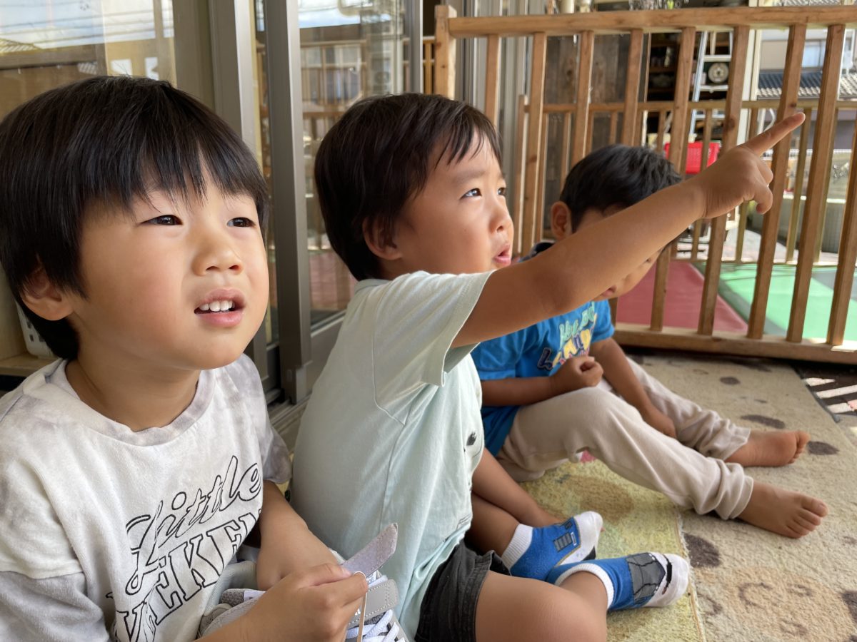テラスに座って雲の観察。流れる雲とタイミングよく飛んでいるトンボを見ながら、「トンボが雲を食べたんかな?」と真剣に話す子ども達でした。
