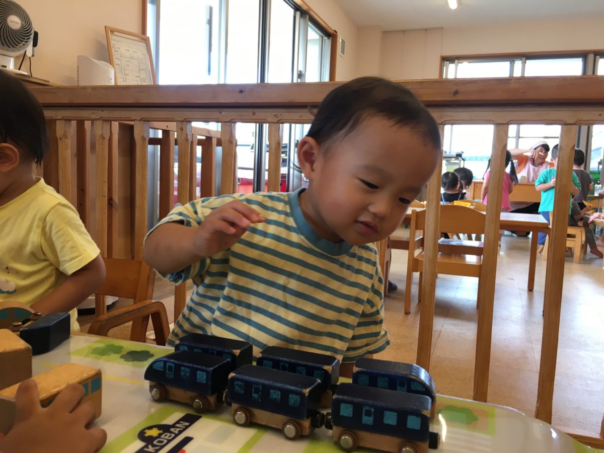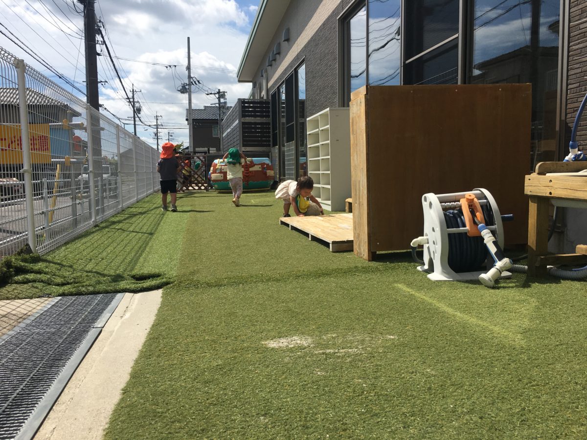 園庭では、ダンスをしたり遊具の周りを走ったりと今日も元気いっぱいな子どもたち。いつもより日差しが強かったこもあり子どもたちからは「あつすぎる~!」とこんな声も。すると「アイスたべたいな~!」あるお友だちがぽつり。「あいしゅ!〇〇ちゃんもたべたい!」と気づけばアイスクリームの話題でとっても楽しそうです。近くにあったベンチをお店屋さんの机に見立て、並んで座ると・・・「いらっしゃいませ~!」とアイスクリーム屋さんの開店です!「あいしゅくりーむどうですか?」「1つください!」「はい、ひゃくえんでーす!」と子どもたち同士のやり取りは立派なアイスクリーム屋さん。店員さんとお客さんに分かれて「チョコレートアイスください!」「めろんアイスにする!」「いらっしゃいませー!!」ととっても楽しそうでした。