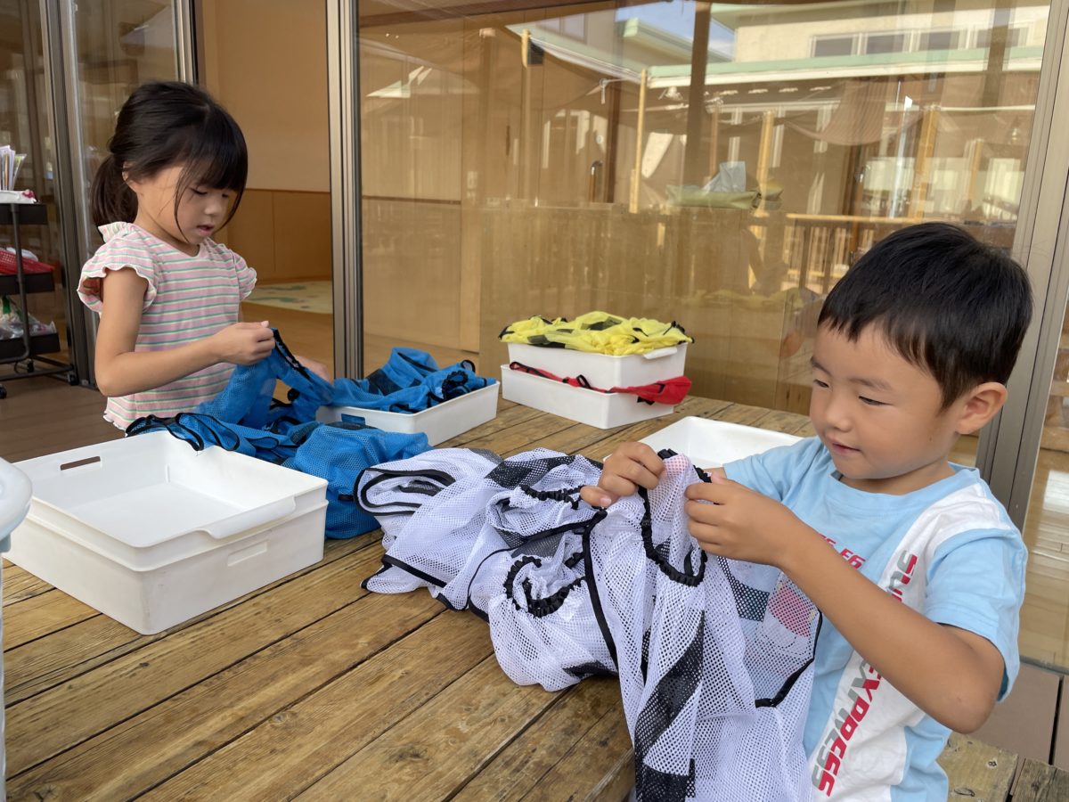 今日は朝からビブスの洗濯が机に置いてあるのを見て「お手伝いしたろ~!」と言ってくれたお友だち。1から順番に数えながら畳んでいたり、「とにかく畳まないと」っと言いながら一枚ずつ畳んでいたりとそれぞれにこだわりを持って洗濯物を畳んでくれていました。