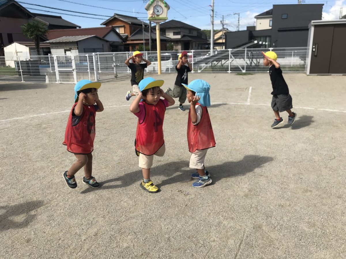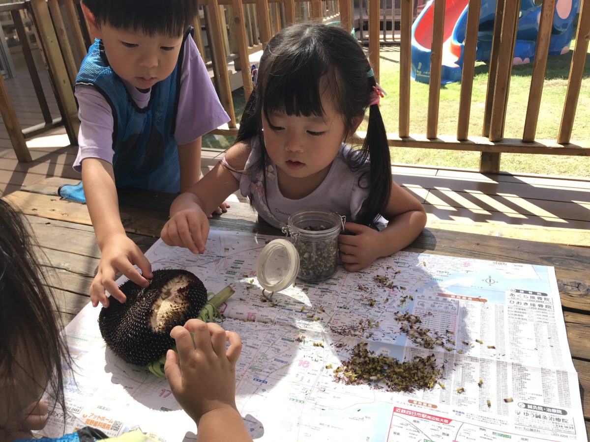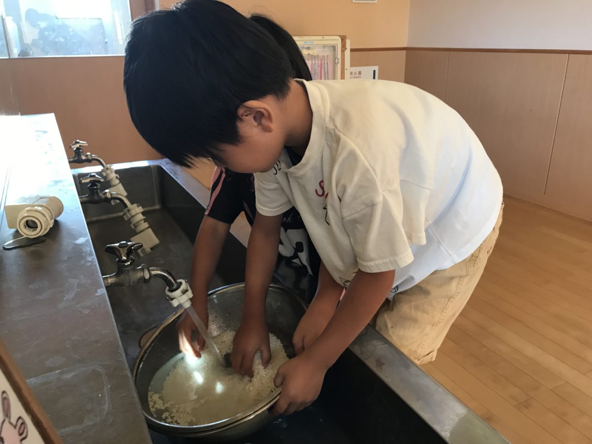 戸外ではダンス鬼ごっこに夢中なお友だち。めろん組のお兄さんが積極的に鬼になってくれて、お友だちみんなが全力で逃げたり追いかけたりして楽しんでいました。ダンスも全力で踊っていたのですが、いつ鬼ごっこが始まるのか分からない緊張感も伝わってきました。途中「捕まった~」と悔しそうにしたり「僕二人も捕まえたんやで!」と自慢する声も聞こえてきて、「まだ鬼ごっこ続けたい!」という声も後からたくさん聞こえてきてみんながとても楽しそうに活動していました。お部屋ではお餅づくりをしようと朝からめろん組のお友だちがお米を洗ってくれました。「水はこれくらい出したら大丈夫!」などと声をかけながら協力していました。お餅を作っている間「まだかな?」と出来上がるのを楽しみにしているお友だちも沢山いました。いざ出来上がったものを見ると、「ごはんみたい!」とびっくりする様子が見られました。お餅を丸めている時は「もちもちしてめっちゃひっつく~」「ほんとにお餅の味するのかな?」と楽しい反面心配する声も聞こえてきましたが、食べてみると「めっちゃおいしい!」と嬉しそうにする姿が見られました。きな粉味のお餅を作ったのですが、きな粉が嫌いと言っていた子でも「これなら食べれる!」と嬉しそうにする姿がありました。りんご組のお友だちも初めてクッキングに挑戦し、不安そうな顔をしていたのですが、お兄さん、お姉さんにサポートしてもらいながら作っていて終わった後はとても嬉しそうにしていて達成感を感じているようでした。また、昨日収穫したひまわりをじっくり観察する姿も見られました。種を見つけようと集中して探していたり、「ここはまだ濡れているね~」と様々な思いを共有する姿も見られました。さらに大きな紙にひまわりの絵を描いたり、折り紙で折ってみたりと採ったひまわりを見ながら自由にお絵描きをする様子もありました。
