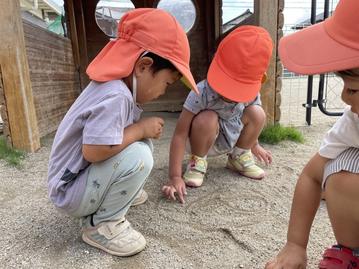 園庭で落ちているピーマンを発見。拾った時にはもう既に割れていたピーマン。中を見ようと覗いていると、別のお友だちが「ピーマン?穴が空いてるの?」と不思議そうに話し、「一緒に見ていい?」と持っていたお友だちに聞くと「いいよー!」というので二人で観察。物凄く真剣に中を覗き込んでいるので、野菜の図鑑を渡すと、大喜んで 図鑑と本物を交互に見比べるお友だち、中に移動して机に座って更に観察。もともとあった割れ目から、指を入れて二つに割ると、割れた部分からピーマンの香りを楽しむ子ども達。「これピーマンやんな?」と割れ目から匂いを確認するとピーマンっぽくない匂いだったのか、「ピーマン?これピーマンなの?」と真剣なお顔で匂いを確かめて、ピーマンの匂いって本当にこんな匂いだったのか疑問も持ちながら匂いを確かめ合っていて、その疑問の詰まったお顔が何とも言えなくて少し笑えてきました。後でどんな匂いだった?って確認すると、「みどりの匂いやった!」と緑の匂いだったことを教えてくれました。