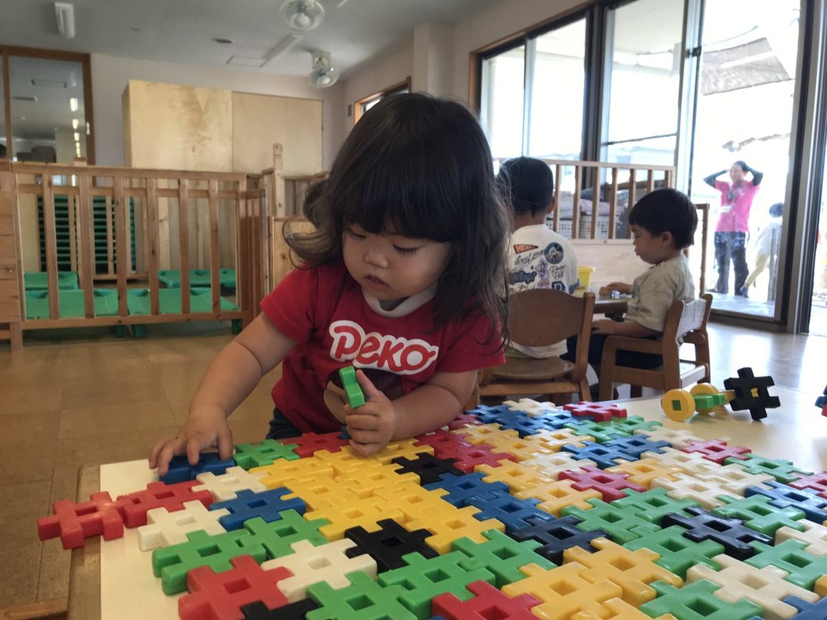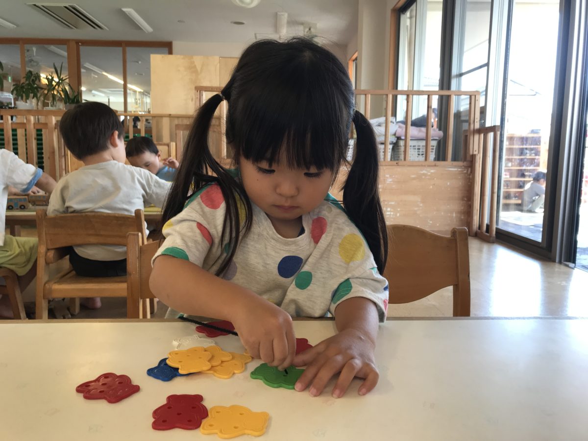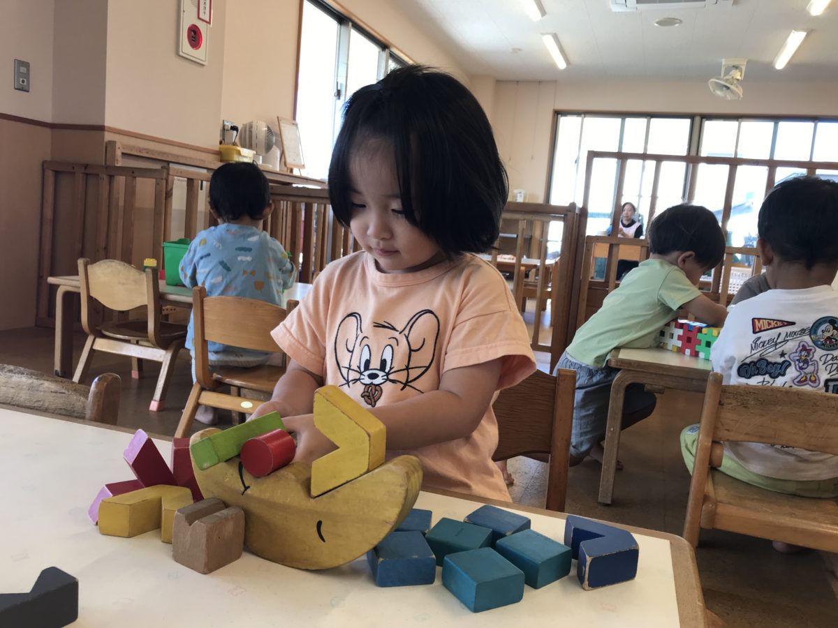 ブロックや紐通し、車のおもちゃなど子どもたちそれぞれ好きな遊びを手に取ると、椅子に座り遊びに真剣な様子。ブロックでは特に井型ブロックがお気に入りな様子で、「よし!よし!よし!」と呟きながら一つ一つブロックを組み合わせていました。そんな様子を見ていた周りのお友だちもブロックに挑戦。お友だちが作っている姿を真似て、沢山四角が出来上がると積み木のように積みながら楽しんでいました。「これこうするの」「こうしよ」とブロックで作った積み木で遊び終えた後はブロックは解体。何をするのだろう・・・?とこっそり傍で見守っていると机一面にブロックを敷き詰め始めていました。「○○くんもやる!」とお友だちと協力し合いながらブロックを敷き詰め終えると「できた!」と嬉しそうな様子。繋ぎ合わせて出来た一枚のブロックを折り紙のように折ってみたり、そこから巨大な四角を作ってみたり・・・。子どもたち同士で工夫しながらブロック遊びに夢中な子どもたちでした。