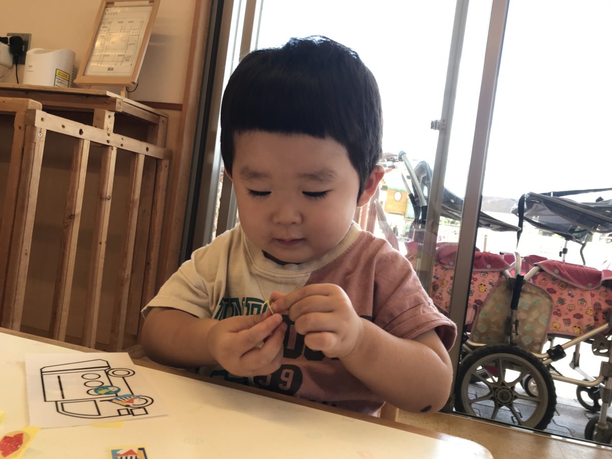 別の場所ではシール貼りに挑戦中のお友だち。シール台紙から中々剥がせず苦戦しながらも真剣にシールを剥がそうと何度も挑戦していると、偶然シールが土台から剥がれ手にペタリ!「わ!できた!」とにっこり嬉しそうな笑顔。段々とコツがつかめてくると、何枚も紙にシールを貼り付けながら楽しんでいましたよ。