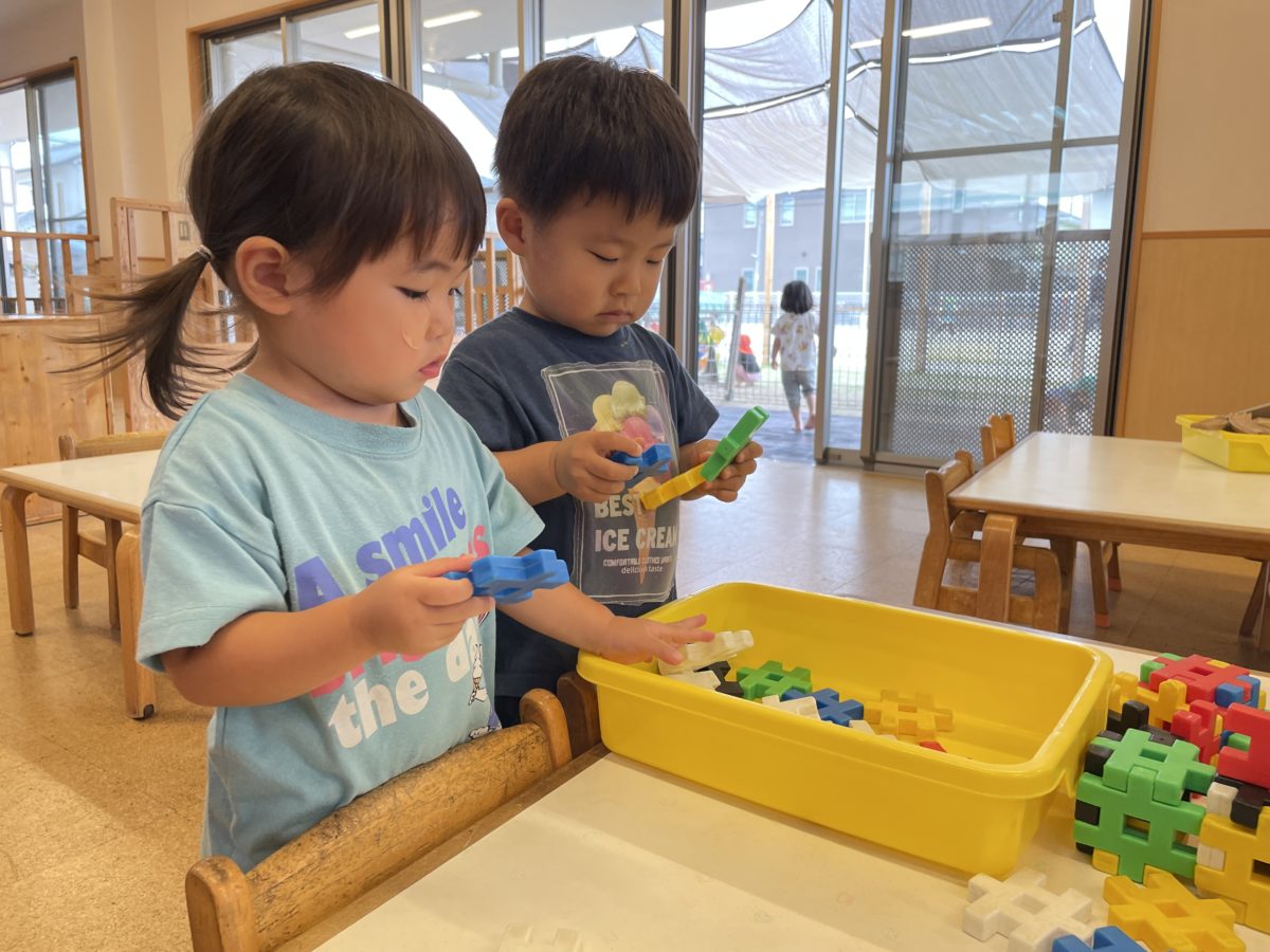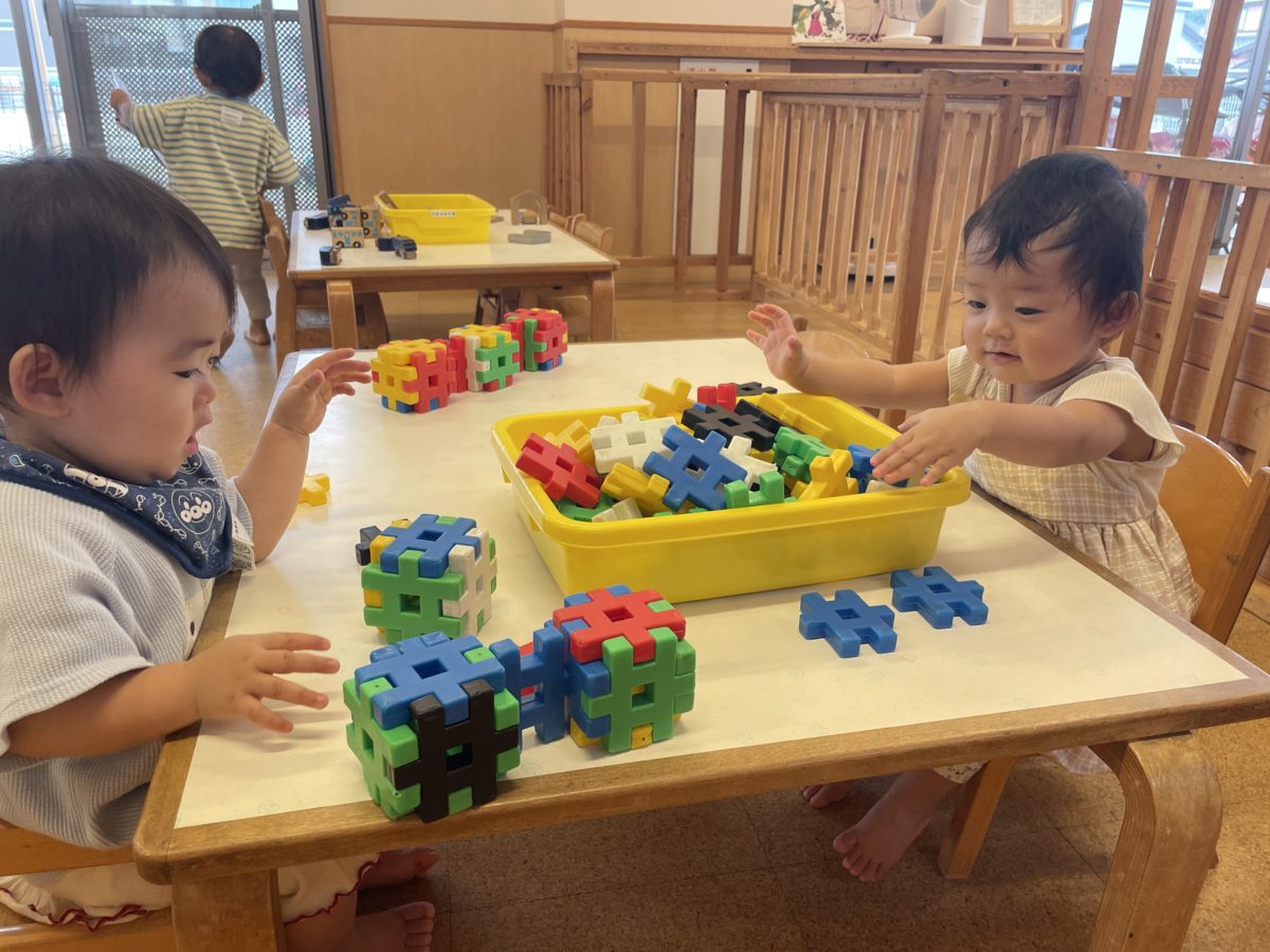 カラフルなブロックを見て嬉しそうに組み立ていました。