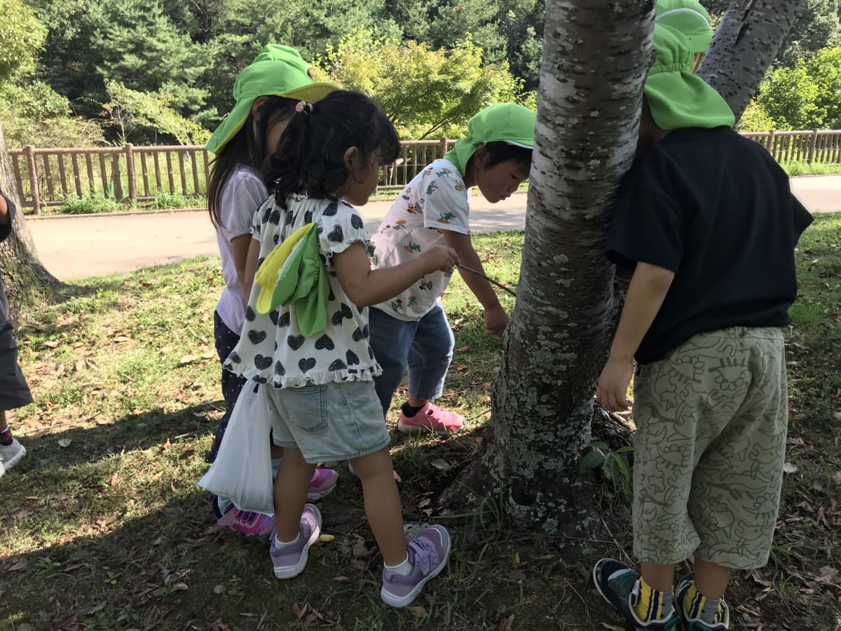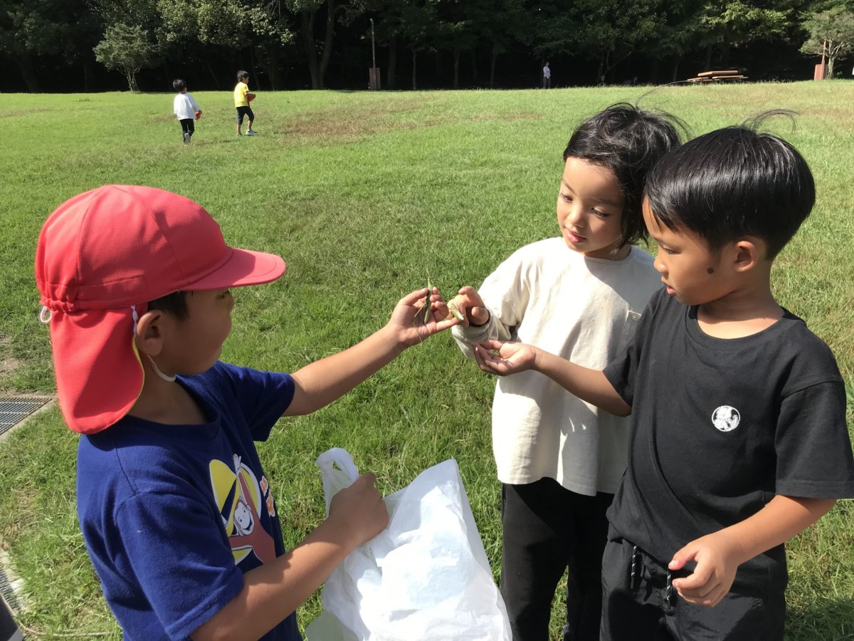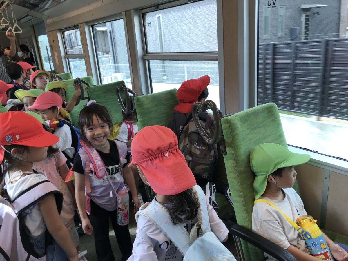 「はやくえんそくいきたい!」「まだかなー?!」と遠足を楽しみに待っていた子ども達。「どこいくのー?」「こうえんかなー!」とウキウキしながら遠足がスタートしました。「まえから、くるまくるよ!」「こっちはあぶないー!」と車や自転車などに気を付けながら歩いていると、道端に咲いている花を発見し興味津々!「あ!このあかいはなしっとる!」「ひがんばなっていうんやんな!」「これはさわったらあかんよー」「あ!かわのところにとりがおる!」「ささごい、っていうとりじゃない!?」と会話を弾ませていました。歩いていると目の前に電車が!「あ!あれあすなろうてつどうや!」「のったことある!」と大興奮!そのまま駅の方へ向って歩いていると「え!でんしゃのるの?!」「のりたい!」ととても素敵な笑顔が見られました。駅で電車を待っているとこんな疑問の声が聞こえてきました。「でんしゃってどっちからくるの?」「えーどっちやろ・・」「こっちやとおもうで!」「だって、さっきあっちにいったから、こっちにくるとおもうー!」とみんなで考えながら電車を待つ姿があり「こっちからふみきりのおとがきこえる・・」「やったー!こっちからきた!」と予想が当たり、とても喜んでいました。電車の中ではちょっぴり緊張しながらも「しずかにー!」とルールを守り外の景色を眺めていました。駅からさらに歩いていくと・・「なんぶきゅうりょうこうえんや!」「ついたー!」と南部丘陵公園に到着し「つかれたー!」「いっぱいあるいたー」「おなかすいた!!」とさっそくお弁当の時間に!「おにぎりにしてもらった!」「デザートもあるよ!」とばなな組のお友だちは久しぶりのお弁当で嬉しそうな表情!みんなと会話を弾ませながら美味しくお弁当をいただきました。その後、広場では「そーっと・・」「えいっ!」「バッタつかまえた!」「むっちゃおっきい!」「ぼくがつかまえたやつとくらべてみよー!」と虫探しや虫の大きさ比べをしたり、「ここいっぱいドングリおちてる!」「このはっぱきれい!」と木の実を集めたりとそれぞれ楽しむ姿がありました。朝早くからお弁当の準備をしていただきありがとうございました。