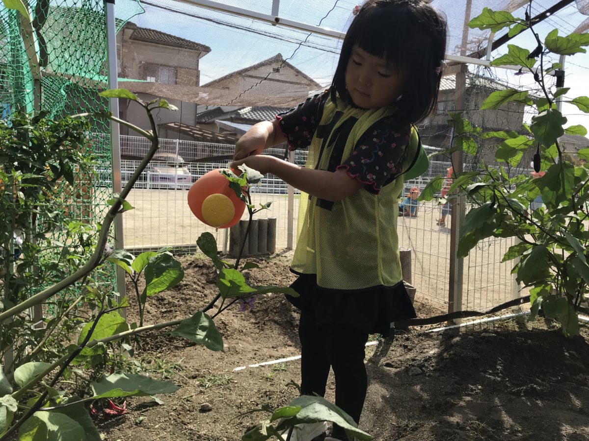 「大きくなーれ!」とまだまだ小さいナスに水やりをしています。