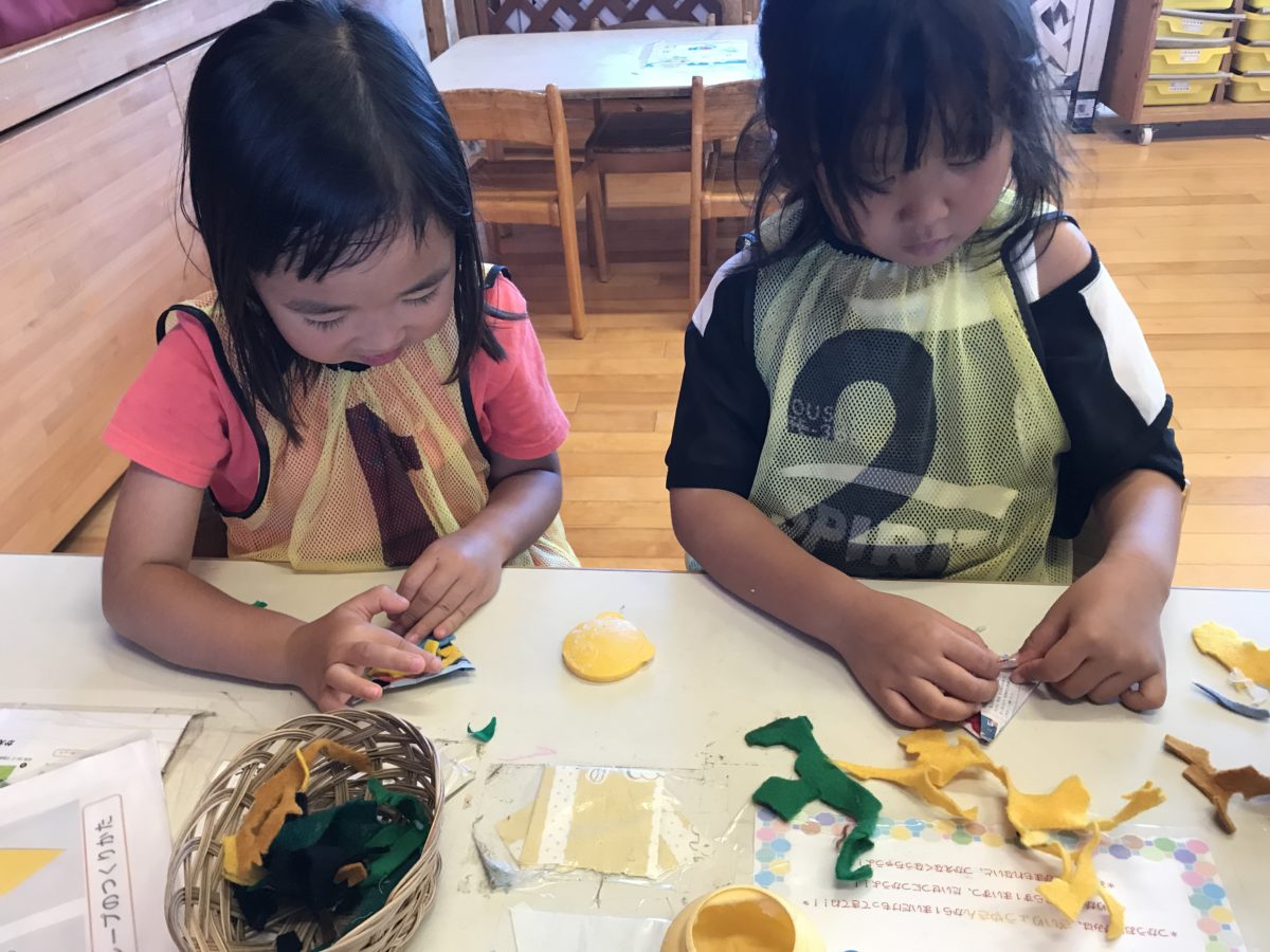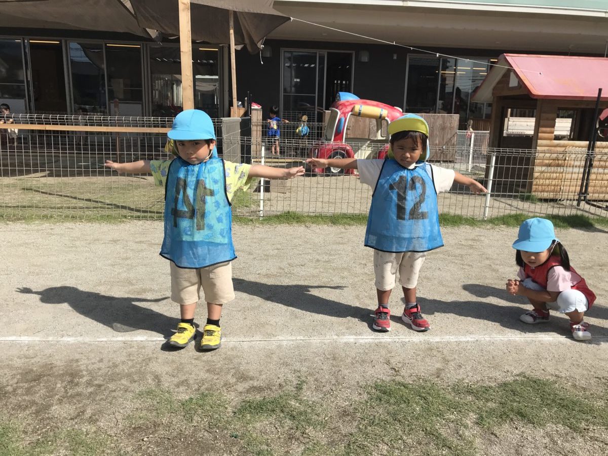 今日は午前中めろん組のお友だちが芋掘りに出かけていたので、ばなな組のお友だちを中心にリレーをしました。リレーが始まる前に「一列に並んでね!」「3番がいない~」などと積極的に声をかけながら、さくらんぼ組やりんご組さんが迷っていると手をとって一緒に走ってあげる様子も見られました。また、走るのを拒んでいるお友だちもいましたが、「一緒に走ろう!」と優しくサポートしてくれたことで喜んで走っている姿が見られました。ダンスはみんなの見本となるよう前で踊っているお友だちもいて踊りが分からないりんご組さんも真似して楽しそうに踊っていました。畑ではまだまだ小さいナスを見て「水やりしたい!」という声があったので、一つのじょうろで順番に水やりを行いました。「土じゃなくて草にかけた方がいいんだよ!」などと教え合っていて、時にはりんご組さんも水やりが出来るよう声をかけていました。外の活動が終わってからはみんなのビブスをたたんでいるばなな組のお友だちの姿がありました。「14番からたたも~」と番号順になるようたたみ方も工夫していました。室内では折り紙でクレープづくりをして楽しんでいました。色々な色の布や色ペンを使ってオリジナルのクレープを作ろうと一生懸命でした。のりを使う際もみんなで順番に使えるよう話し合いながら使えていました。