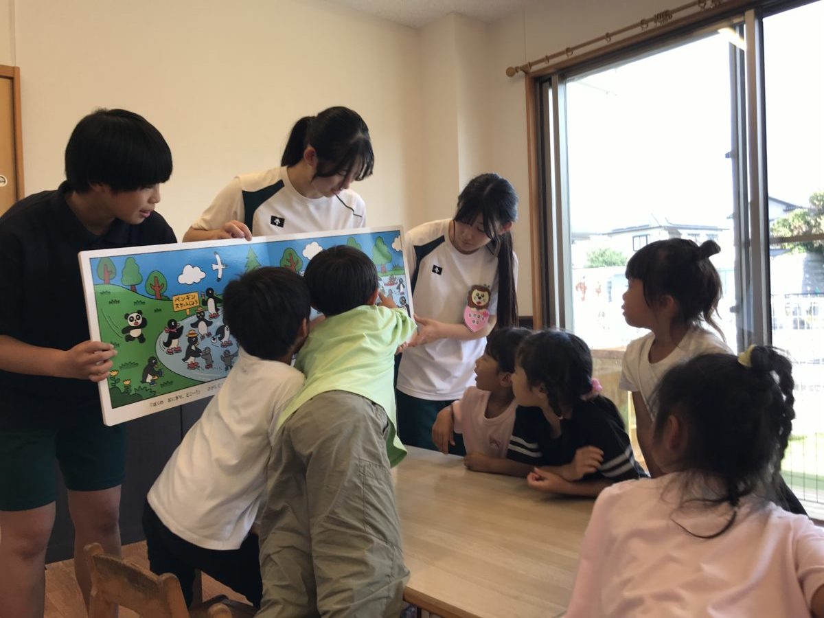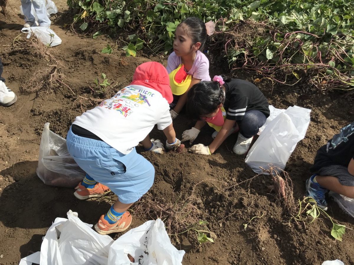 天気も良く、風の涼しさを感じながらさつまいも掘りへ出かけました。「きょうはさつまいもほりや!」「きのういっぱいねたから、げんきになった!」と昨日の疲れも吹っ飛び、今日も元気よく歩く姿がありました。道中では「か・わ・ら・だってかいてある!」とひらがなを読んだり、昨日も見た彼岸花やバッタなどを見つけたりと一緒に手をつないでいるお友だちと会話を弾ませていました。また、歩いていると何やら果物を発見!「なんかできてる!」「これみかんじゃない?」「かきもある!」「こっちのはっぱが・・かき!」「ちいさいきのほうが、みかんやなー!」と形や色をじっくりと観察し見分けていました。さらに山道を歩いていくと・・「ついた!」「じゃがいもほりのときもきたよな!」と思い出し、「こんにちは!」「おねがいします!」と地域の方にきちんと挨拶をする姿がありました。いざ、さつまいも掘りへ!「ここ、おいもみえる!」「ほんまや!」「おおきいやつとちいさいやつがある!」と興味津々!「これひっぱったらぬけるかな?」とツルを引っ張り「うんとこしょ!どっこいしょ!」「やった!とれた!」と収穫できるととても嬉しそうな表情!「ここに、おいもあるけどとれやん・・」「あなほったらいいんちゃう?」とみんなで協力しながら、それぞれ目の前にあるさつまいもを真剣な表情で収穫していました。帰り道も「いっぱいとれた!」「ツルにいっぱいついとるやつあったよ!」とたくさんのさつまいもが取れたことをお友だちとお話しながら保育園まで戻ってきました。午後からは、農芸高校のお姉さんに来ていただき絵本の読み聞かせを聞いたり、園庭で鬼ごっこをしたりとまだまだ元気いっぱいの子どもたちでした。