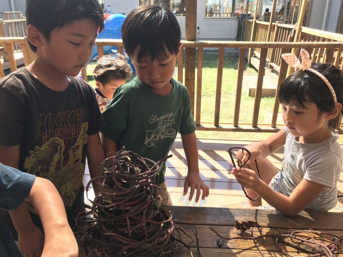 昨日の芋掘りで採ってきた芋の茎をくるくる巻いて冠を作っています。「わからない~」というお友だちがいたら「僕が作ってあげるで!」と助け合いながら作っていました。