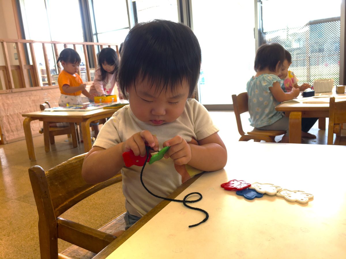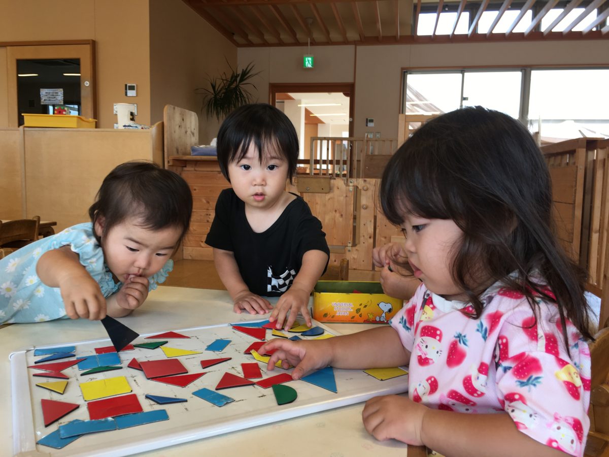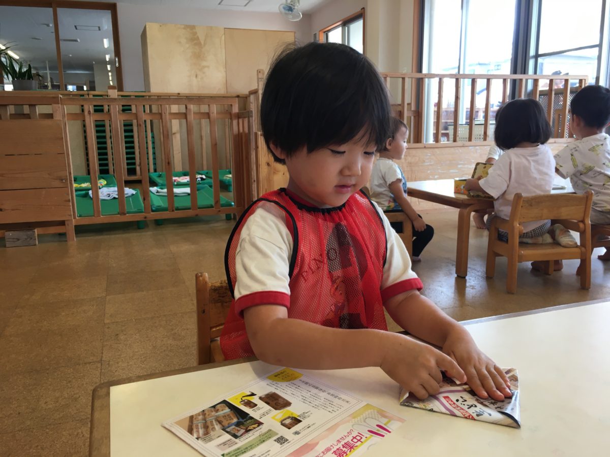 折り紙に興味を持ち始めている子どもたち。今日も保育士が折り紙を手に持っていると「これやりたい!」と早速こんな声が聞こえてきました。椅子に座ると、それぞれ真剣な眼差しで何かを折ったり、小さく破いています。なかなか上手く折れず苦戦しながらも、折り紙の角を色々な方向に折りこむと・・・「おにぎりだよ!」とどうやらおにぎりを作っていたようです!「これなにおにぎり?」「おにぎりなにはいってるの?」とおにぎりの具材を思い浮かべているお友だち。「あ!これいれる!」と目の前にあった紙を丸めると紙で包み「ほら!できた!」「えめぼし!(うめぼし)」と梅干おにぎりの完成。そんな姿を見ていた小さいお友だちも、一生懸命紙を手のひらで丸めてみたり、折ってみたり。「おしえてあげようか?」「ぱっくんちょつくれるよ」とりんご組のお友だちがいちご組のお友だちに折り方を教えてあげたりと折り紙に夢中な子どもたちでした。