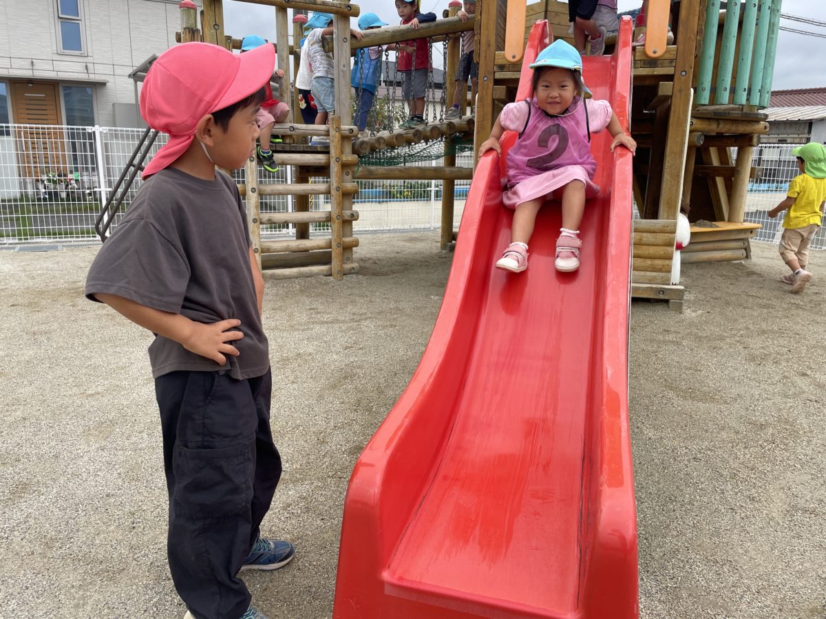 お外では、滑り台の順番を守って!とめろん組さんが下に立って「いいよー!」「すべって~!」と交通整理をしてくれていました。すぐに行こうとするお友だちに「待って!前の子が降りてから!」とルールを教えてあげている姿があり、頼もしいめろん組さんでした。