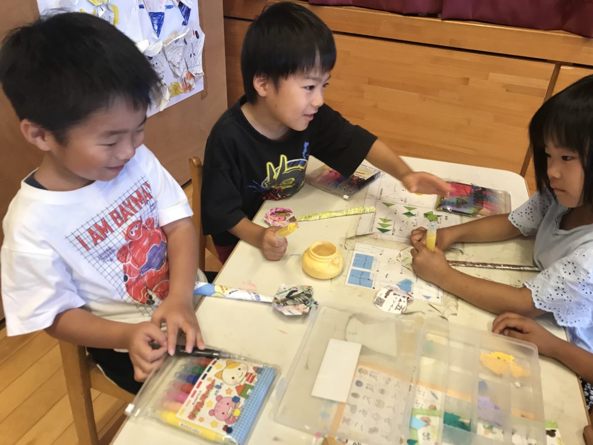 「べんきょうしたーい!」とカートに乗っているあいうえおのノートを持ってきためろん組さん。みんなで机に集まって文字をなぞったり、真似して書いてみたりと楽しそうに文字を書いている姿がありました。ひらがなをなぞっていると、「この字なんて読むん?」「これむずかしい~消しゴム貸して!」とお友だちに「読める?」と聞いたり何度も書き直している姿がありました。ノートが終わっているお友だちも出来るように乗り物や果物、色の名前が書いてあるプリントを用意していると、「これ書きたい!」とみんなで書き始める姿があり、一枚出来上がると「なまえ書いとこ!」と裏面に大きく名前を書いていました。りんご組のお友だちは、「なにしてるの~?」とお兄さんたちが書いている文字に興味津々の様子で机の横でじっと見ている姿がありました。