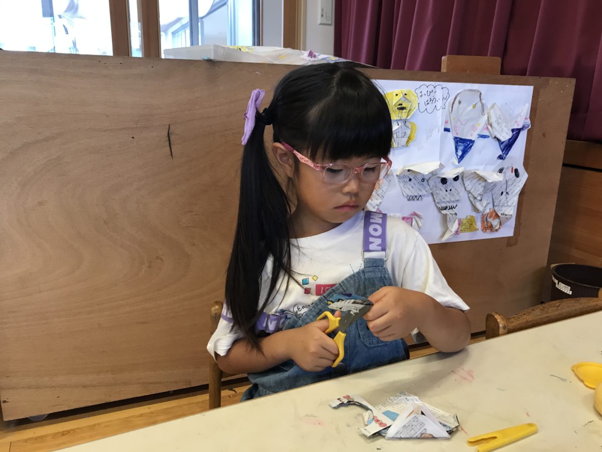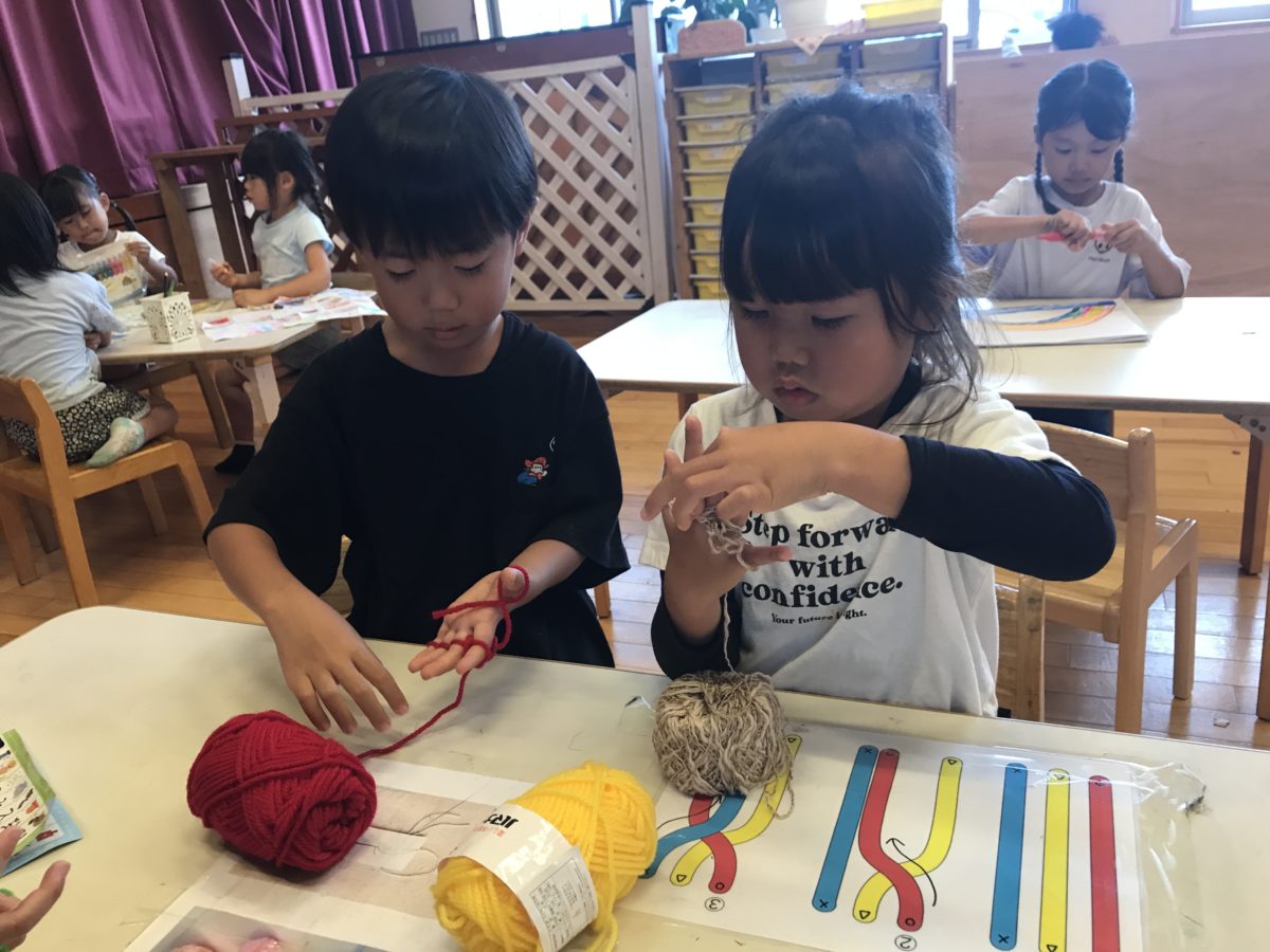隣の机では、手編みでマフラーを作っているお友だちが。前々からずっと作っていてやっと今日完成して「見て!長いのできた~!」「これマフラ~!」と完成したマフラーをお友だちに見せていました。それを見た他のめろん組さんも「ぼくも作る~」「わたしも~!」と素敵なマフラーを見て次々に「つくりたーい!」と自分の好きな色の毛糸を持ってきて手編みを始めていました。作っていると「長くなってきた~」「やっぱりカチューシャにする!」と長くなってきて喜んでいる子やマフラーではなくカチューシャを作っている子などいろいろなものを作って楽しんでいました。
