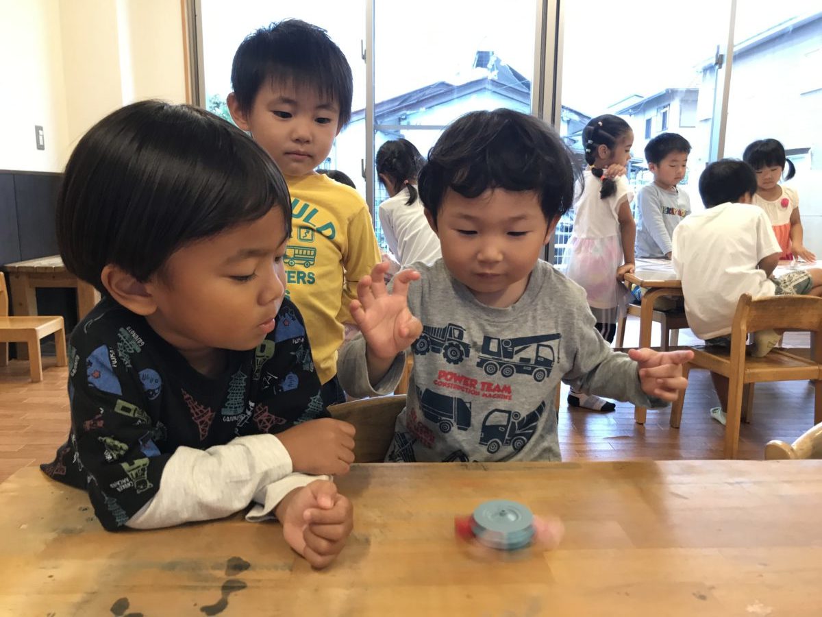「こうしたらまわるで!」とさくらんぼ組のお友だちに教えてもらい、りんご組のお友だちもコマ回しに挑戦!「みて!まわった!」と嬉しそうな表情でした。