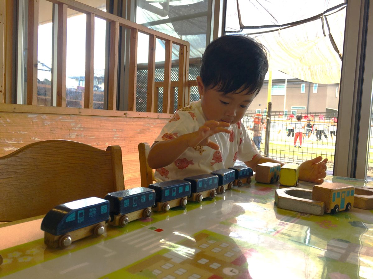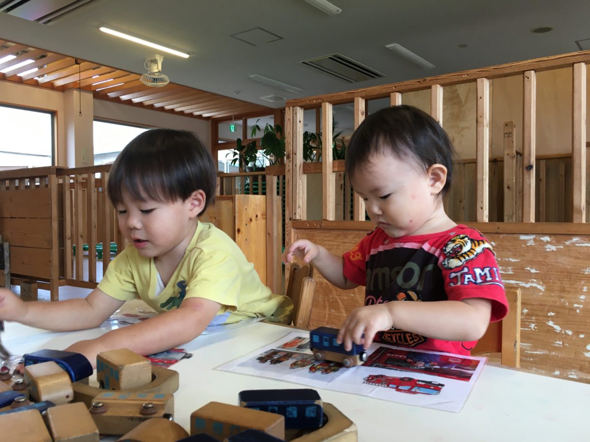 「これブルーだよ」「これなにいろ?」と身の回りの色に興味を持ち始めている子どもたち。お友だちや自分が身に着けているものを見ながら「ぼくグレーなの」「○○くんはきいろだよ」と服の色をお友だち同士で教え合ってみたり。そんな様子から、色のカードを置いてみると「どんないろーがすき?」「きいろ!」と楽しそうな声が聞こえてきました。”どんないろがすき?”の音楽を流してみると歌を口ずさみながらカードを見ています。「どれがすき?」「ぼくパープルがすきなの」と色の名前を英語で呟く声も。更に遊びを広げられたら・・・とカラフルなセロファンが入った色のカードを準備してみることに。「○○ちゃんきいろ!」「ぼくはあお!」と好きな色を早速手に取るとカードを覗き込み「わぁ~あおいろになったよ!」とびっくり!お友だちと交換し合いながら「きいろくなったよ!」とカードを覗くと周りの景色の色が変わることに興味津々な様子。そんな中、偶然カード同士が重なり出来上がったのはカードの色とは別の色。「あれ?いろかわったよ!」と違う色を重ねると色が変わることに気が付いたようです。「ほらみて!」「きいろとみどりこうするの」「ほら!オレンジなった!」とオレンジに大変身!「ぼくもやる!」「あ!むらさきだー!」と色の組み合わせを変えながら色作りを楽しんでいます。「つぎくろつくるの」と全ての色を重ねてみたり、同じ色同士を重ね色の濃さの変化に気が付いたり。色への興味を広げる子どもたちでした。