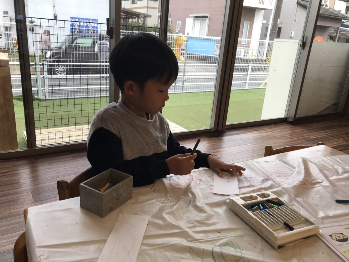 「ポケモン描きたい!」「ねえ黒ない~?」自分の好きなポケモンを描こうと色鉛筆やクーピーを使って描いていました。