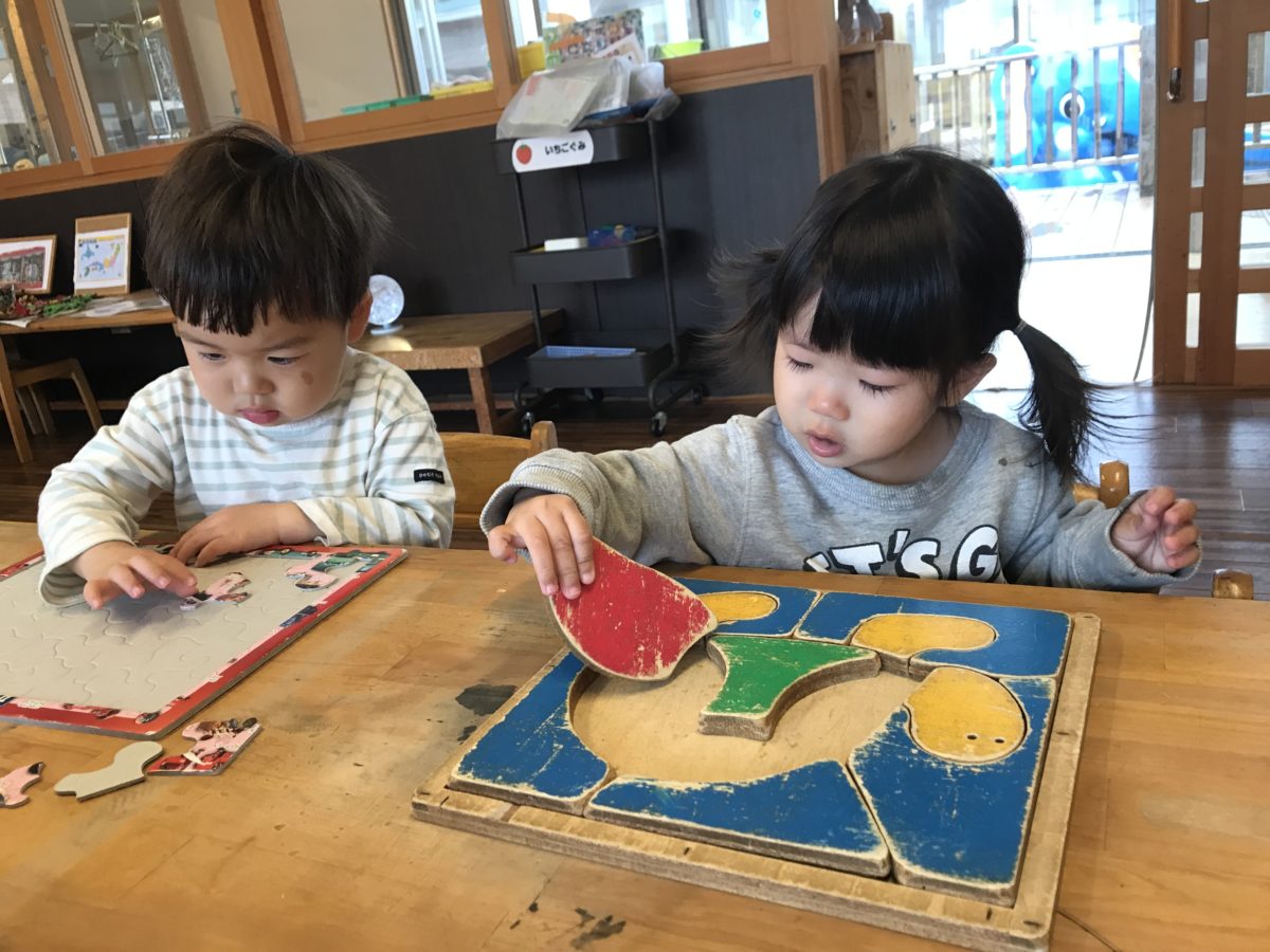 「このバスここ~!」「カメさんしてるの~」と口にしながらパズルに取り組んでいました。