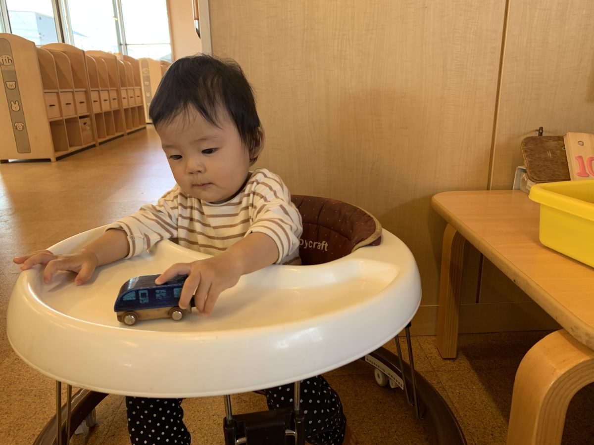 すいか組のお友だちは、いちご組さんのお部屋に来て、電車のおもちゃをお友だちからもらうと嬉しそうに行ったり来たりさせて「きゃー!」と声を上げていました。いちご組のお友だちは、小さい子が来てすっかりお兄さんお姉さんの気分になり、頭を撫でてみたり、おもちゃを渡してみたりして楽しんでいました。