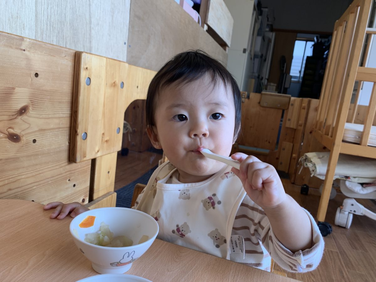 お給食を食べる時に、今まではスプーンを持ってもじっと見ていたり、食器にカンカンと当てていましたが、今日はスプーンを持つとしっかり食材をすくって自分で口に運ぼうとする姿がありました。自分で食べれてうれしかったのか美味しい!と言うような表情を浮かべていました。子どもたちの成長が増え、驚かされています。