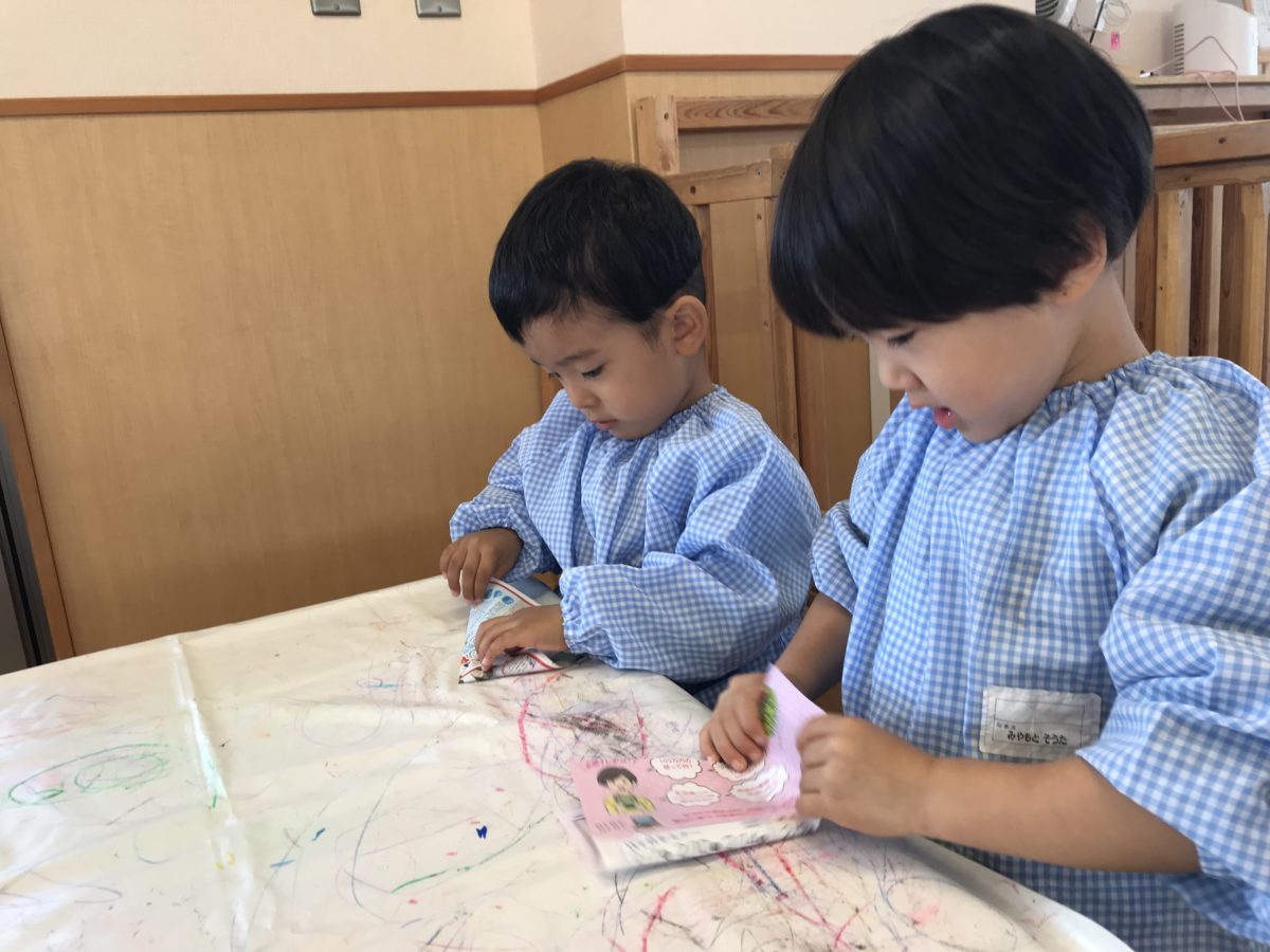 お部屋で折り紙をしていたお友だち。「かみひこうき折る~!」「どうやって折るの?」とお友だちとお話ししながら折り紙を折っていました。なかなか上手く折れずに途中で諦めてしまった子もいましたが、折り紙を使って紙飛行機を折ってその子に渡している姿がありました。お友だちに手伝ってもらいながらできた紙飛行機を嬉しそうに手に持っていました。