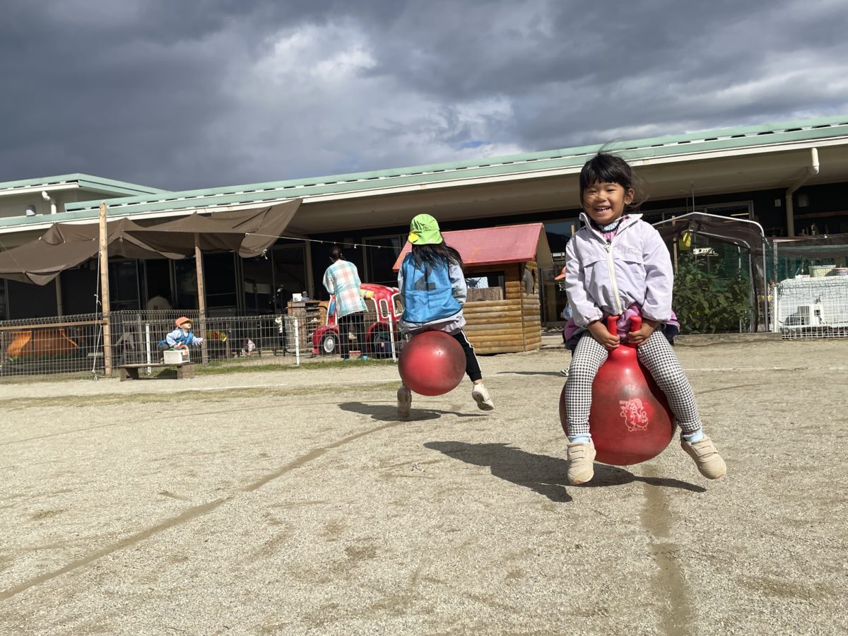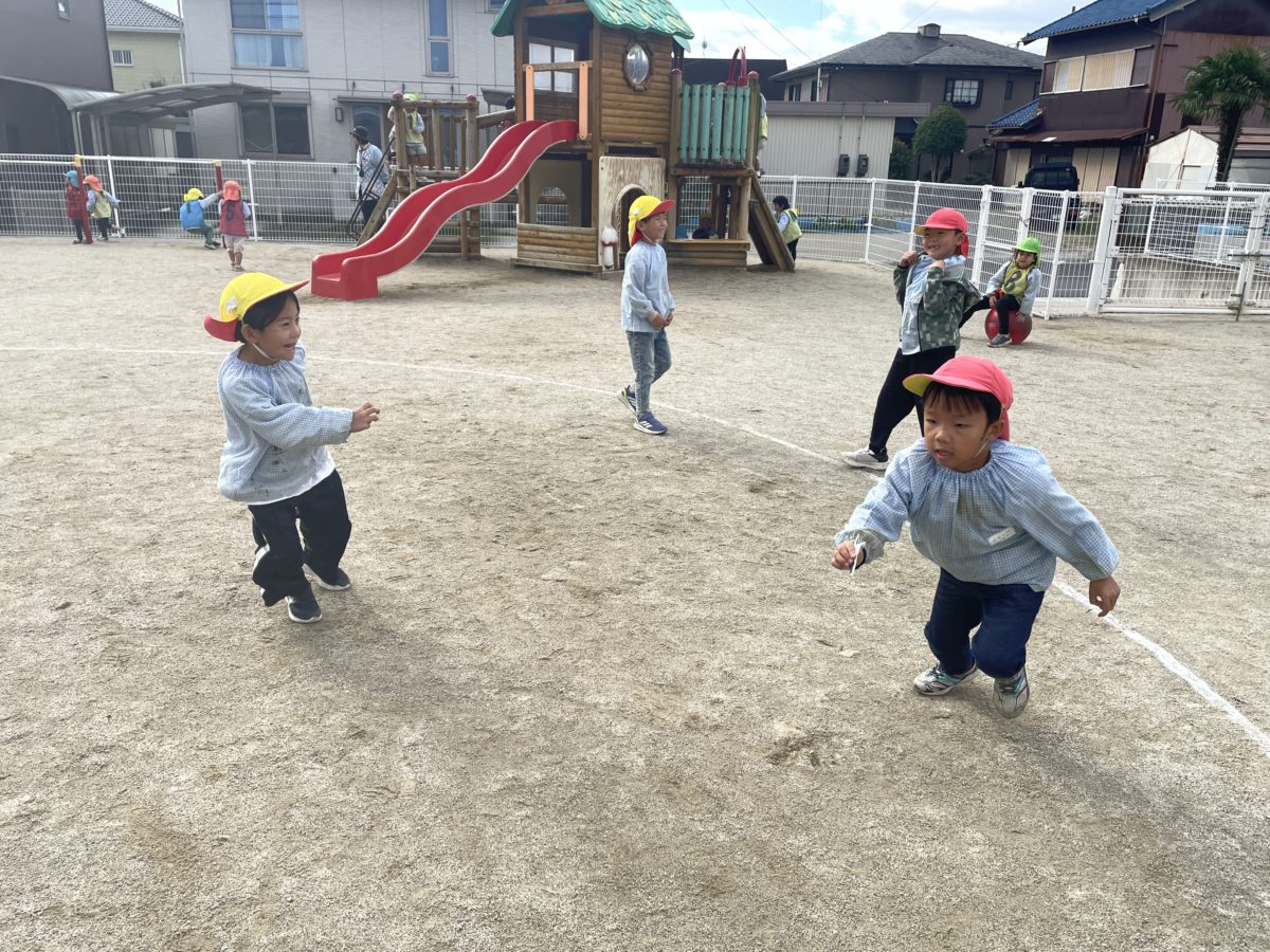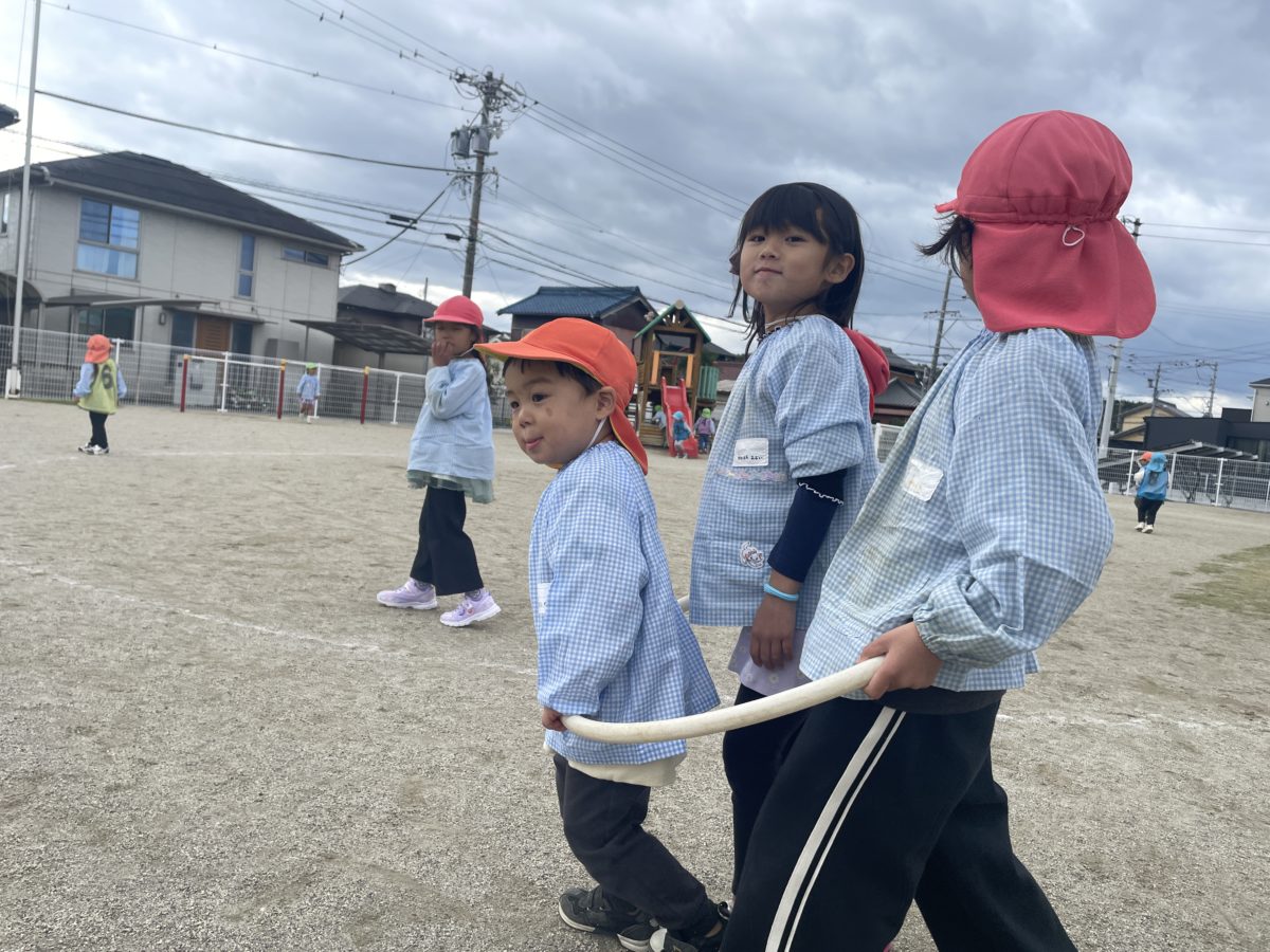 園庭でバランスボールをして楽しんでいた子たちが「このうえすすもうよ~!」と線の上を飛んで進み始めました。「まがるところはどうやってすすめばいいんだろう?」とカープの進み方に迷っていると…「ピョンピョンしながらからだをまげればすすめるかも?」と上半身だけ上手く曲げると思ったよりも上手にカーブを曲がり切れたようでした。「できたできた!!」とその姿を見ていたさくらんぼ組の子も同じように進んでいく姿があり、またいつもとは違う楽しみ方を見つけていました。園庭へ出たころは晴れていましたが次第に雲が段々と分厚くなり暗くなったのを見て「ねーねーもうすぐあめふってくるんじゃない?」「ほら、あっちのほうみてみて」とお友だちを呼んできて雲を見ながら「ほんとうや、なんかくろーいくもがそらいっぱいになってる。」「たいようもかくれちゃってるね。さっきまでたいようもあったのに。」と時間とともに空に黒い雲が広がってきたことに気が付きながら、また太陽の方が黒い雲には隠れてしまうこと、黒い雲=雨が降るということも子どもたちの中で気が付いているのか「これはもうすぐあめがふってくるな!」「かみなりもなるかな?」などと予想をしていたところ、本当にその数分後に雨が!!「やっぱりな!ぼくのいったとおりやったやろ?」と子どもたち同士で話している様子もあり、遊びながらも自然と空の様子や雲の流れなども観察しているようでした。