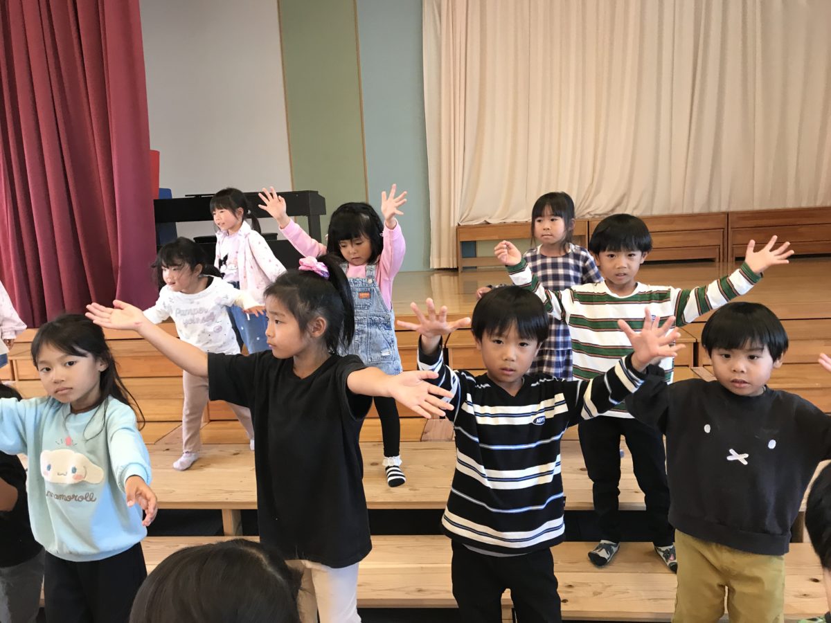 新しい曲のダンスに挑戦中。途中曲のテンポがあがると、難しそうな表情を浮かべるお友だちもいれば、笑顔で踊っているお友だちもいました。