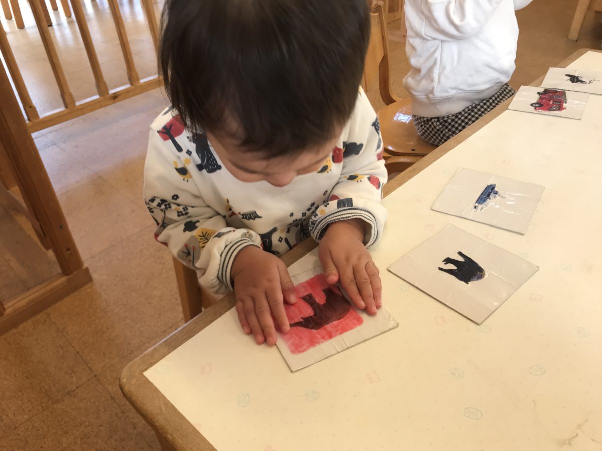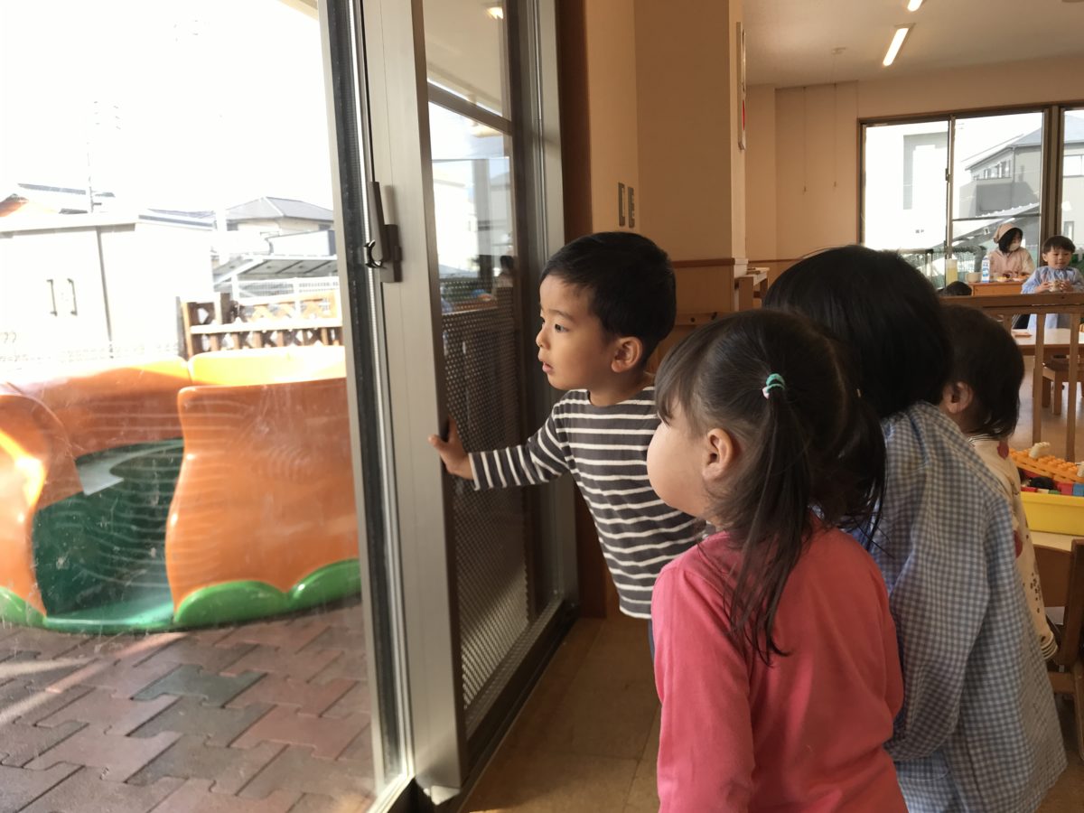 お部屋で遊んでいると「ぴゅーん」と何かが飛んできて、「なになに?」「むしさんおった!」と興味津々な子ども達。窓に止まっている虫さんをじーっと見つめて「動いた!」「足いっぱいあったよ!」「柔らかそうやで!」と観察をする姿がありました。おやつを食べ終えて戻ってきたお友達にも「ここに虫さんおるよ!」「みてみて」と教えている姿もありました。