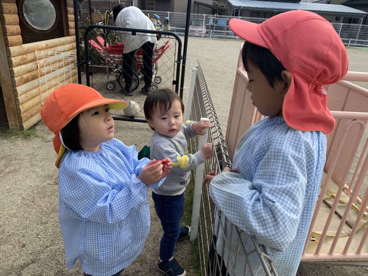 「むしさんがいるよ!」「歩いてる!」みんなでじーっと眺めていました。