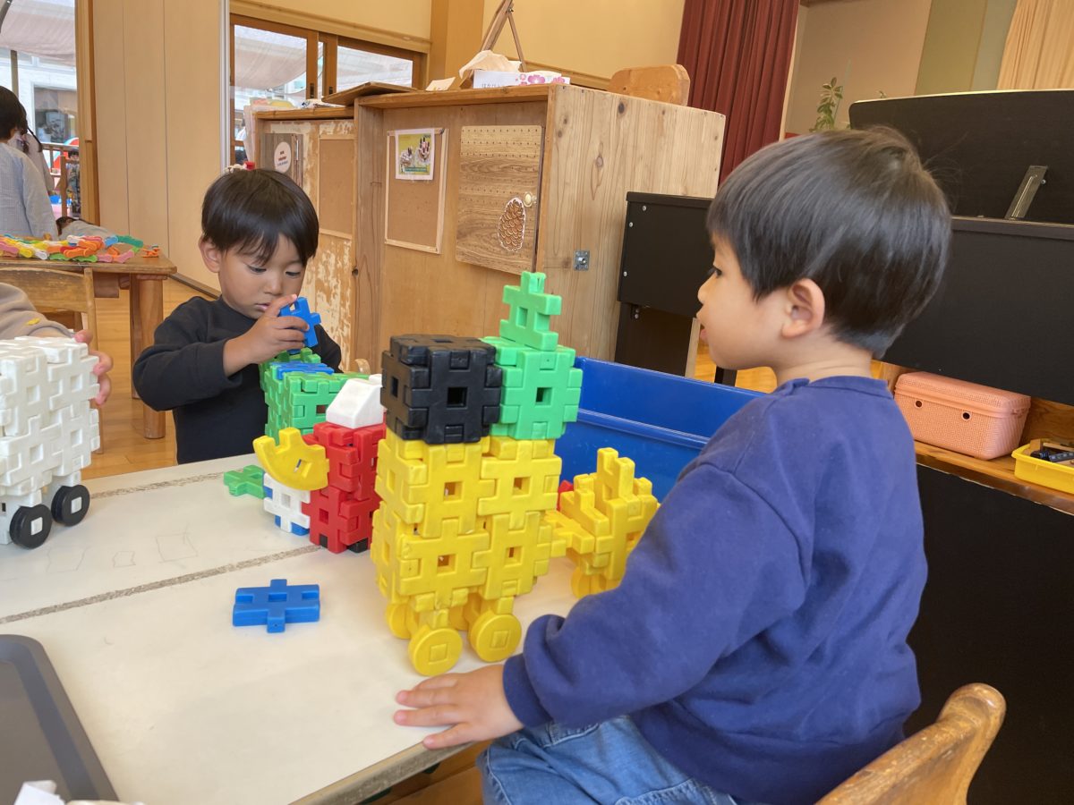 真剣に何を作っているのかな?と覗くと、「トラック作ったよー!!」「これは大きな荷物!」と上に積んであるブロックが大きな積み荷らしく。色々話してました。