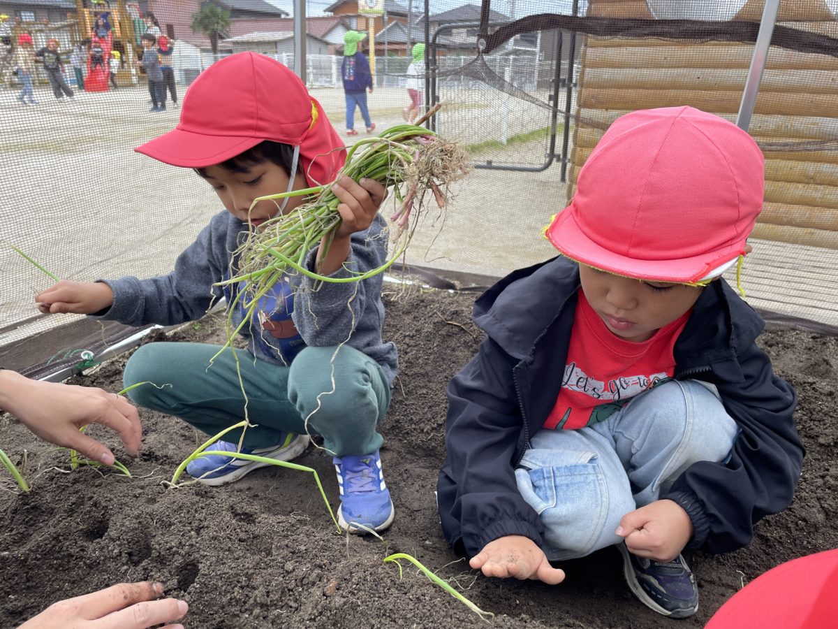 今日はダンスを舞台で踊っていると、ふとダンスの振りが昨日畑で夏野菜を抜いた時と同じようなことを思い出したようで、踊りながら「これ野菜抜いとる見たいやな〜!」「確かに似とる!」と喜びながらダンスを踊る姿がありました。畑が綺麗になったので、冬に向けて苗植えをしました。畑の野菜の苗植えもお手のもので、指一本分の穴を開け、そこに玉ねぎの苗を植えながら、「これなんやっけ?白菜?」「違うよ!玉ねぎだよ!」と楽しそうに会話をしながら苗植えをしましたよ。