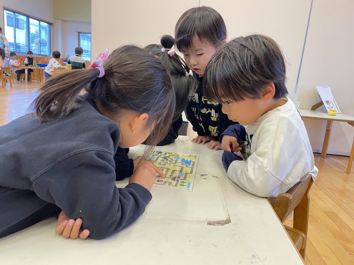 迷路の紙を渡すと自分たちの指で道を辿って迷路を楽しんました。