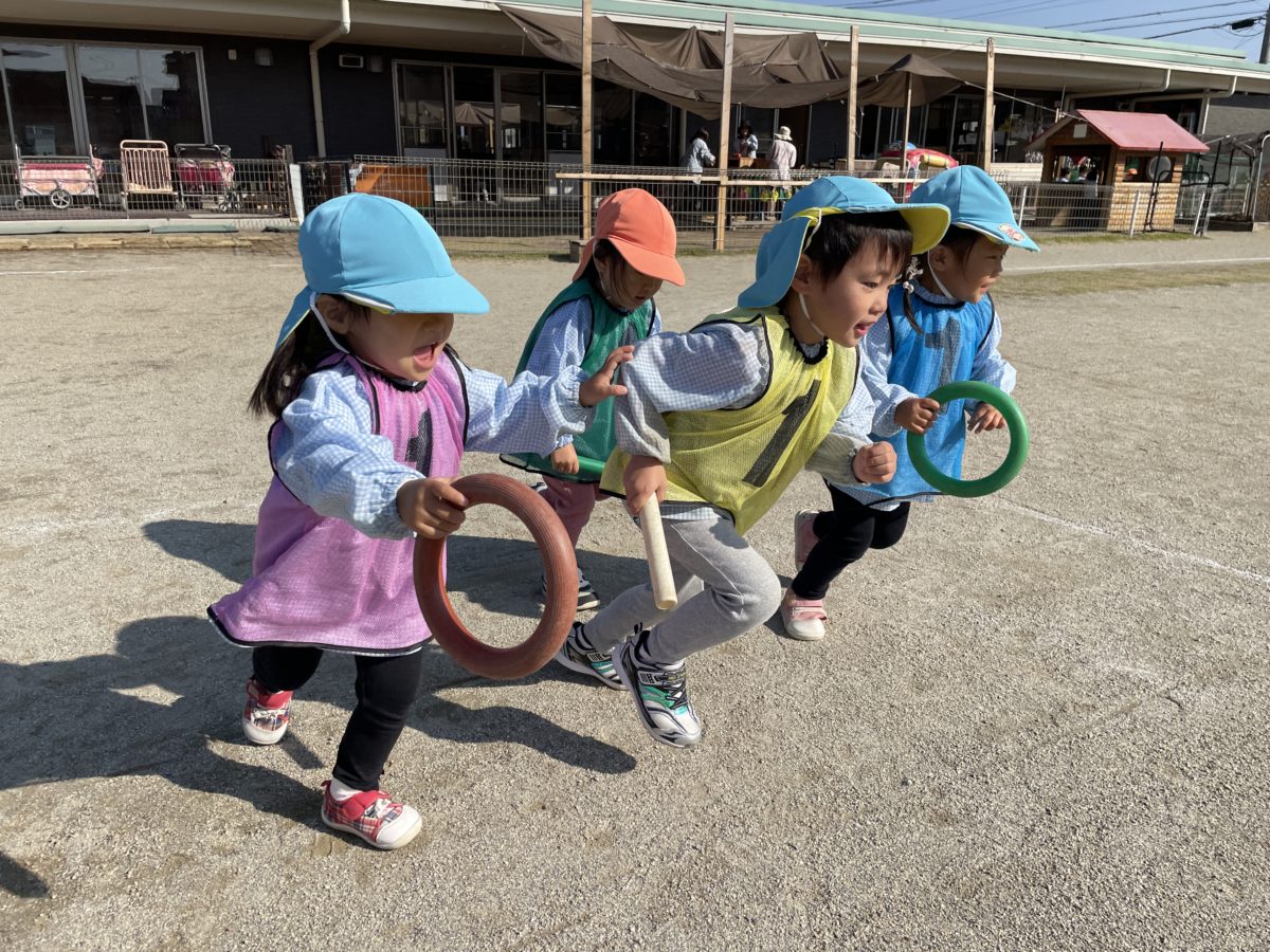 めろん組・ばなな組のお兄さんお姉さんがいないことでさくらんぼ組さんのリレーもいつもと違う流れとなり、いつもは大きいお友だちに頼っているお友だちがひとりで走っていたり「つぎは○○ちゃんやな」などと自分たちで確認する姿がありました。