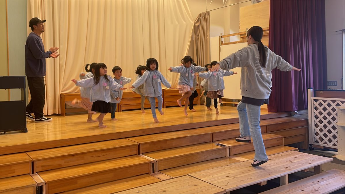 今日は、ばなな組さんがとっても楽しみにしていたダンス教室!!「きょう、めろんぐみさんおでかけするから、ばななぐみがだんすきょうしつするんでしょ?」「きのうつくったなまえのしーるつけなくちゃ!」とやる気満々な様子の子どもたち。朝の準備を終わらせると、さっそく自分の名前のシールを見つけ「じゅんびかんりょう!!」と準備を整えていました。いざ始まったダンス教室では、ダンスの先生の動きを見ながら同じように踊ろうと真剣な表情のお友だち、参加できるのが嬉しくて笑顔で踊るお友だちなどいろいろな様子が見られました。