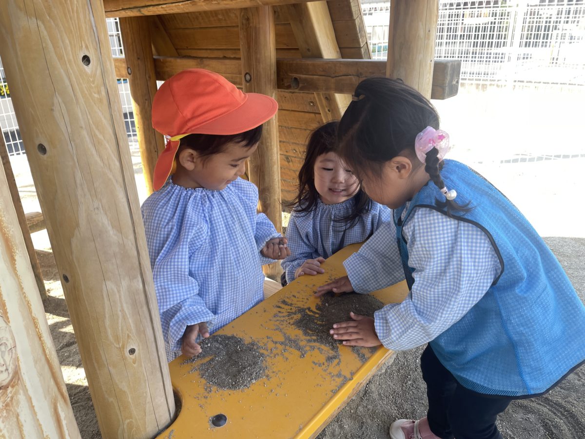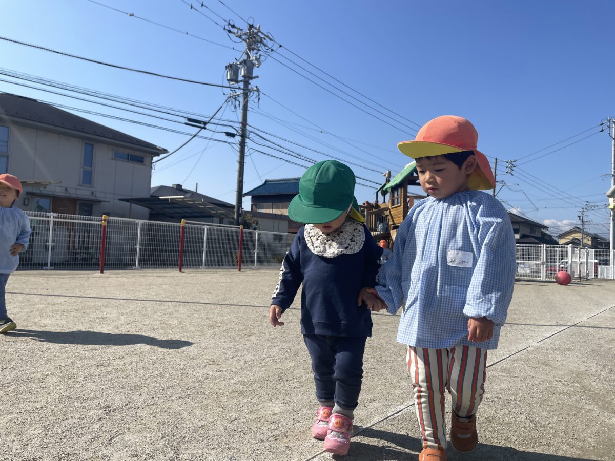 また、広い園庭に遊びにきたいちご組さんに優しく寄り添うりんご組さんの姿も見られ、自分がしてもらったこと、かけてもらった言葉と同じように行動する姿に、みんな少しずつたくましくなっていると感じさせられました。