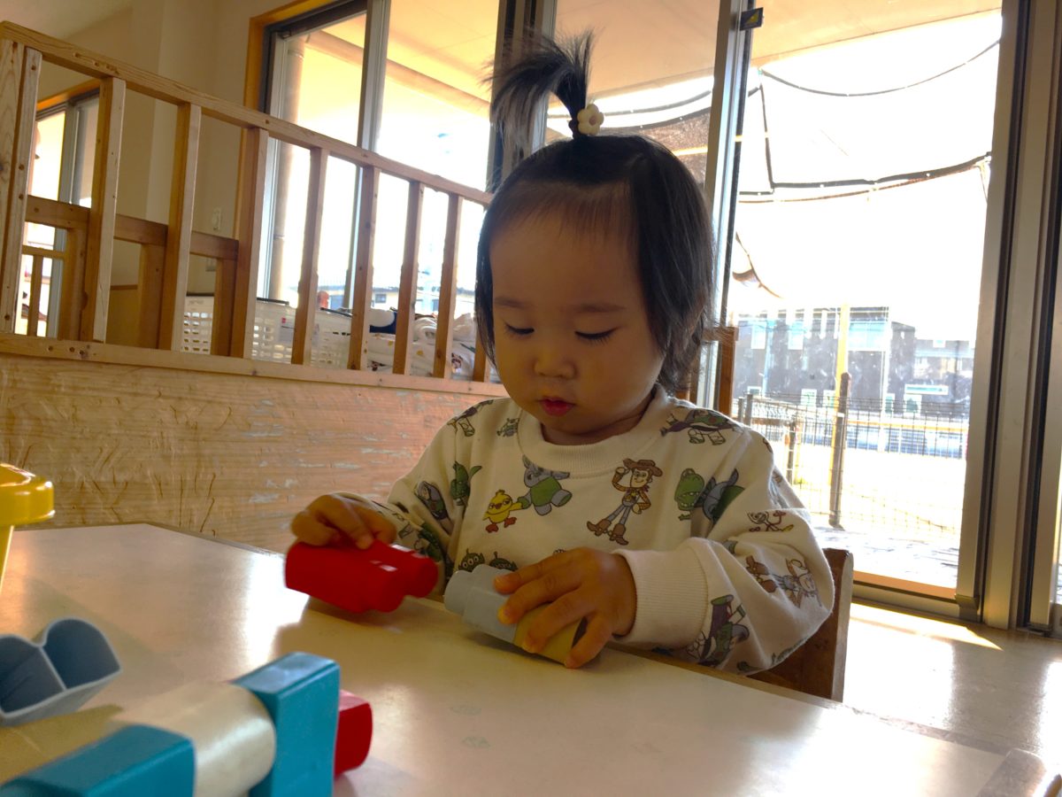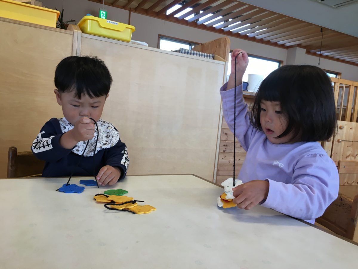 Bブロックやソフトブロックなど好きなおもちゃを手に取り黙々と遊ぶ子どもたち。中でも集中して遊んでいたのが紐通し。小さな穴に一生懸命紐を通そうと真剣ないちごぐみさん。手元を見つめながら夢中になって通していると「できたー!」と紐いっぱいに通すことができました!カラフルなくまの形をした紐通しを見て「ほら!」とお友だち同士で見せ合っていました。そんな姿を遠くから見ていたすいかぐみのお友だち。じーっと興味津々な様子で紐通しをするお友だちの姿を見つめています。椅子に座ると早速紐を手に取り紐通しに挑戦!慎重に慎重に紐を通そうとしますがなかなか通らず苦戦中。その後も何度も紐を通そうと挑戦していました。