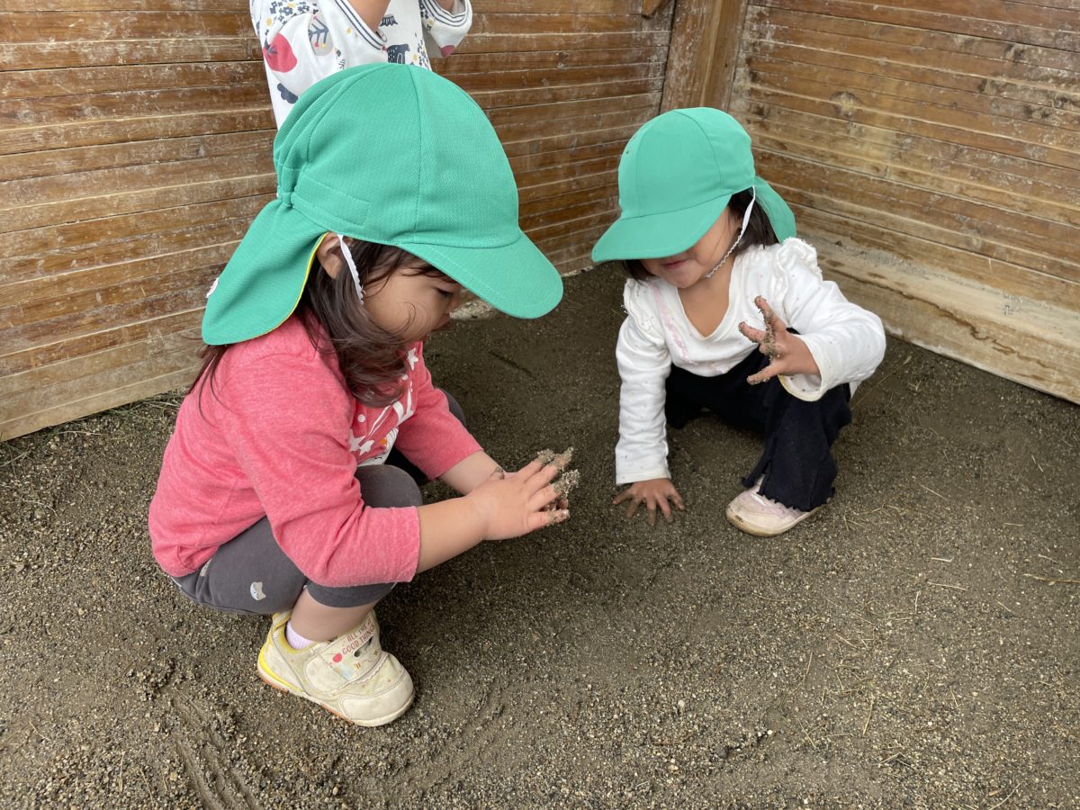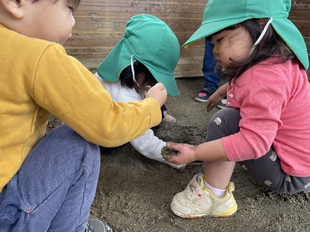 今日は戸外で沢山遊びました。帽子掛けから自分で帽子を探して、帽子を被るというのも大分習慣づいてきたようで、自分のマークを指さしながら帽子を探しています。また、最近りんご組さんで大流行りのお団子作りをいちご組さんもやり始める姿があり、雨上がりで湿った土を手に握ると、両手でギュッと握ってお団子づくりスタート。握ったお団子をログハウスのヘリの所に並べたり、お友だちに渡してみたりしてました。そのうち、お団子を一つの所にまとめていて「おだんごおっきい~!」と楽しそうに話していたり、一つの所に砂を集めて固め、「お山できたよ~!」と嬉しそうにしていたりと、砂を使って工夫して遊ぶ姿がありました。またお友だち同士での会話も少しずつではありますが楽しむ姿があって、今日は「パパ、ママいった!」「みんなおしごとよ~。」とお友だちが言っている事に対しての返事もしていて、お互いに相槌を打ったりしながら、会話を楽しむ姿がありました。お友だち同士での関わり合いもますます増えてきて、とっても楽しそうです。