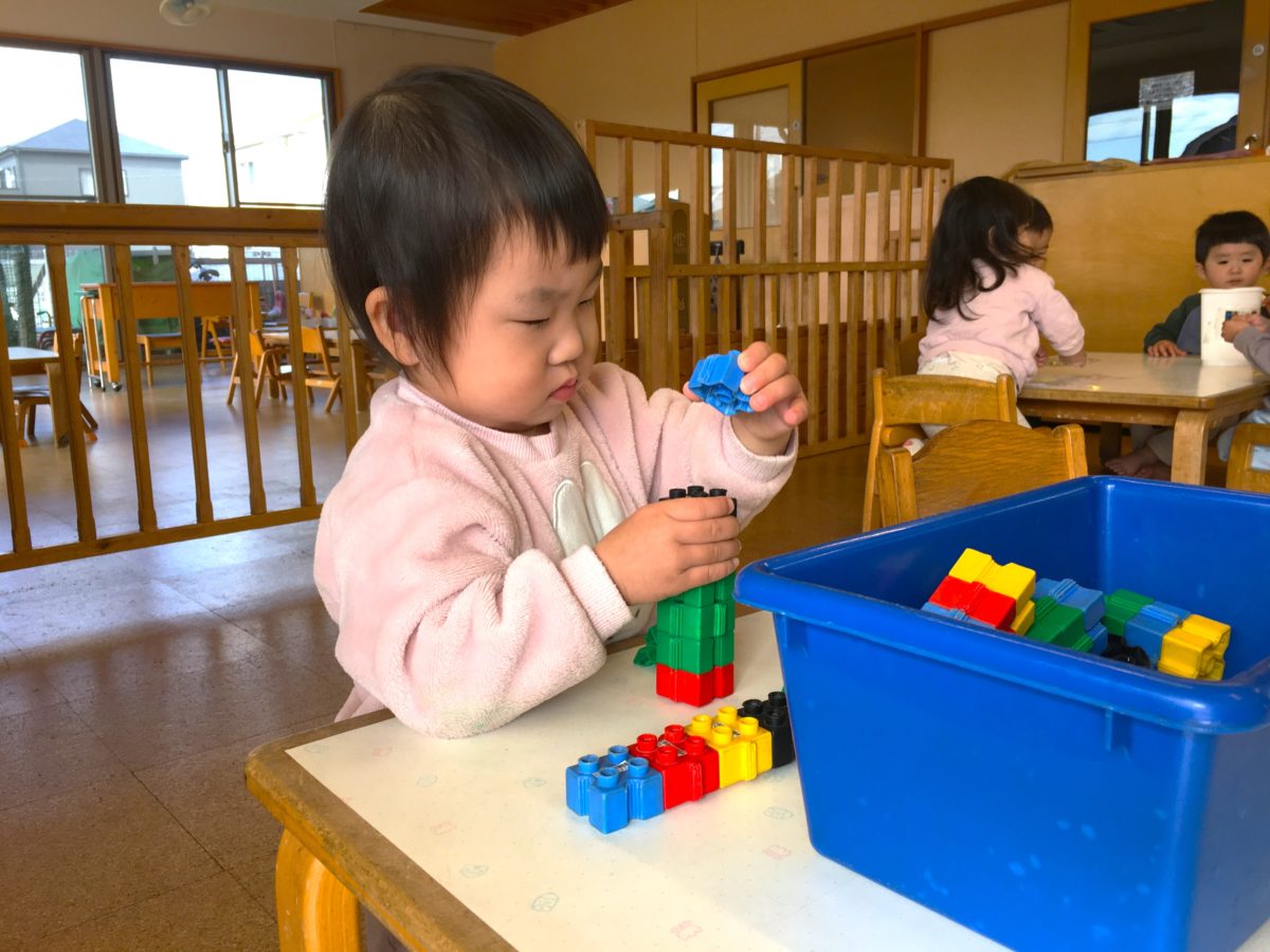 一方別の場所ではシール貼りやブロック遊び、紐通しなどそれぞれ好きな遊びを見つけ、集中して遊ぶ子どもたち。中でも真剣に遊んでいたのがシール貼り。「これちょうだい」「どうぞ」「シールいっぱいだよ!」とお友だちと会話を楽しみながら、台紙いっぱいにシールを貼り付けています。「みて!できた!」と完成した台紙を見せ合いながらシール貼りに夢中な子どもたちでした。