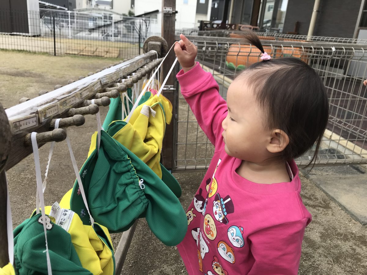 園庭では、靴を履いて、帽子を探して、指でマークを辿り自分のマークを見つけると、手に取り反対向きやずれたりしながらも、自分で被っている姿がありました。遊んでいる最中に帽子が脱げているお友だちがいると、「あ!」と言いながらその子のもとに帽子を持っていき、被せてあげようとしている姿があり、被せても被せても帽子を脱いでしまうお友だちに「ん~!」と言いながらもめげずに被せようとしていました。被ってもらえると嬉しそうな表情を浮かべていました。お部屋に入ろうと、靴を脱ぐと自分で靴箱に持っていき、靴を片付けていました。なかなか上手く入れられず落ちてくる靴を何度も拾いながらも最後は綺麗にしまうことができていました。