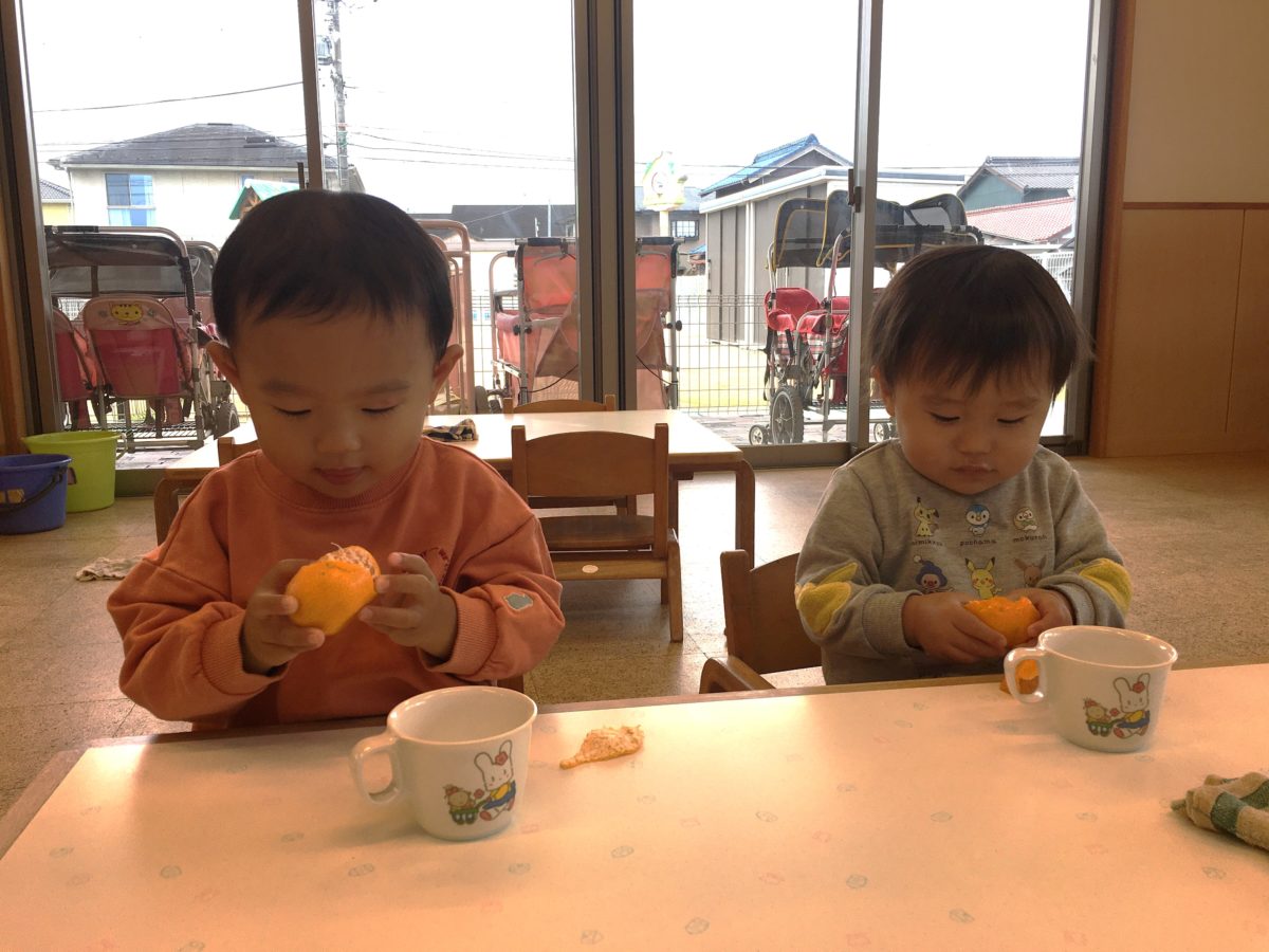 保育士が朝のおやつの準備をしていると、今日のおやつは何だろう・・・?と遠目で見ています。「みかん!」と今日のおやつがみかんであることに気が付くと、とっても嬉しそうな表情。真っ先に手を洗いに行き椅子に座ると、ニコニコしていた表情も一瞬で真剣な眼差しに。みかんの皮を少しずつ器用に 剥くお友だちもいれば、これはなんだろう?と不思議そうに見つめるお友だち。すると、隣で皮を剥いているお友だちの姿を真剣に観察しています。皮が剥けることに気が付くと、再び皮むきに挑戦です!一部皮が剥けると、そのままみかんを齧りにこっと嬉しそうな表情。美味しかったのか、皮を剥いては丸かじりを繰り返しながら美味しそうにみかんを食べる子どもたちでした。