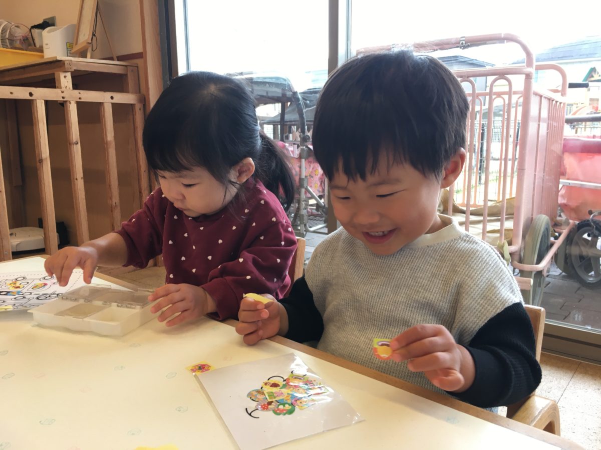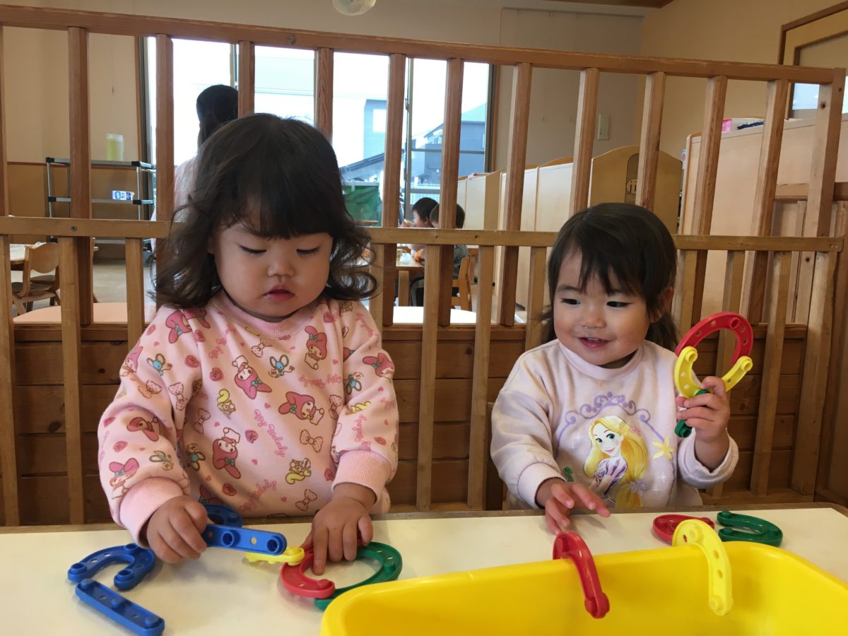 おやつを食べた後は、ブロックや砂場、シールなどそれぞれ好きなおもちゃを手に取り遊んでいます。中でも夢中になって遊んでいたのが棒や半円の形に丸い凸凹のついた変わったブロック。様々な形を組み合わせて完成したのは虫メガネの形。「みてー!できた!」「まるいね~」「こやってするの」と虫メガネのように丸い穴を覗くと色々な所を見渡しながら見ています。お友だちと向かい合い覗き合いをしてみたり、「もっかい!」と別の形のブロックを使い次は楕円型の虫メガネが出来ると「これはアイスなの」とアイスクリームを作るお友だちの姿も。様々な形を作り、完成した作品を見せ合いながら楽しむ子どもたちでした。